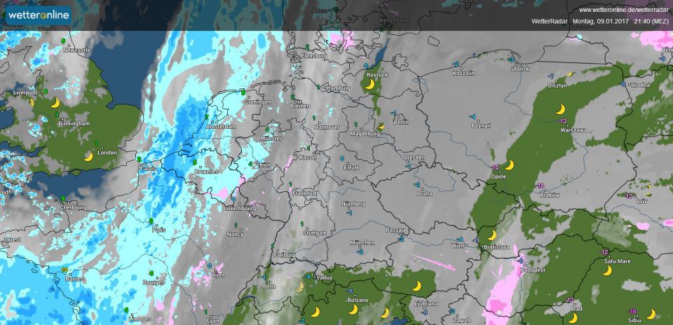 Am späten Abend des 09.01. ist es meist noch trocken. Die Niederschläge rücken aber näher.
