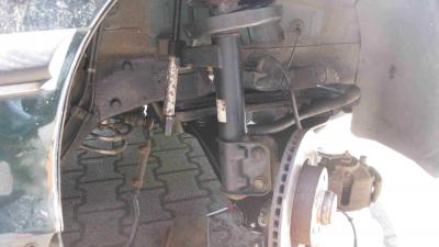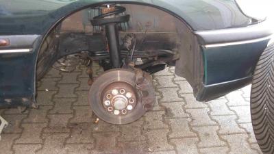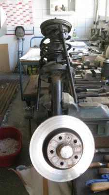 Nun war der Weg frei um unter dem Einsatz der Federspanner das Domlager des Federbeins zu wechseln. Ging ruckzuck. Hier nun das ausgebaute komplette Federbein mit Achsschenkel und Bremse.