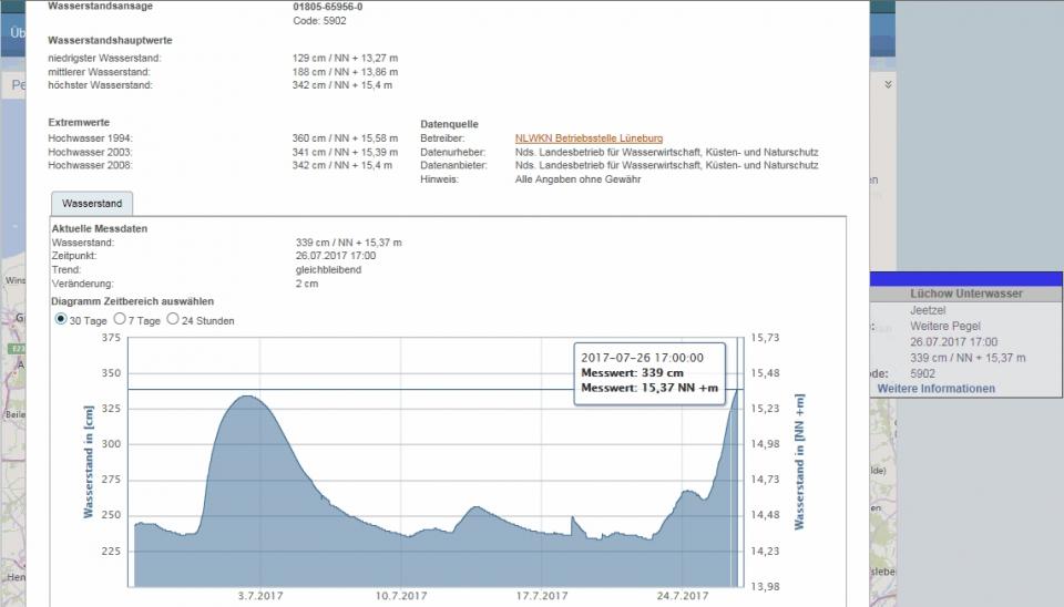 Der größte "Regionalfluss" hier im Wendland, die Jeetzel, schickt sich gerade an, den bisher höchsten Wasserstand zu erreichen. Der Pegel steigt weiter recht flott und die Nebenflüsse und Bäche stauen bereits zurück und überfluten Felder und Wiesen. In einigen Dörfern ist die Feuerwehr im Dauereinsatz beim Auspumpen der Keller, weil der Grundwasserspiegel nun überall stark ansteigt und das Wasser durch die Bodenplatten drückt. Man kann sogar beobachten, wie Teiche, die keinen Zufluss haben nun plötzlich ansteigen und sich vergrößern. So etwas habe ich zuvor ja auch noch nicht erlebt. Hier der Pegelstand der Jeetzel in Lüchow um 17 Uhr heute: