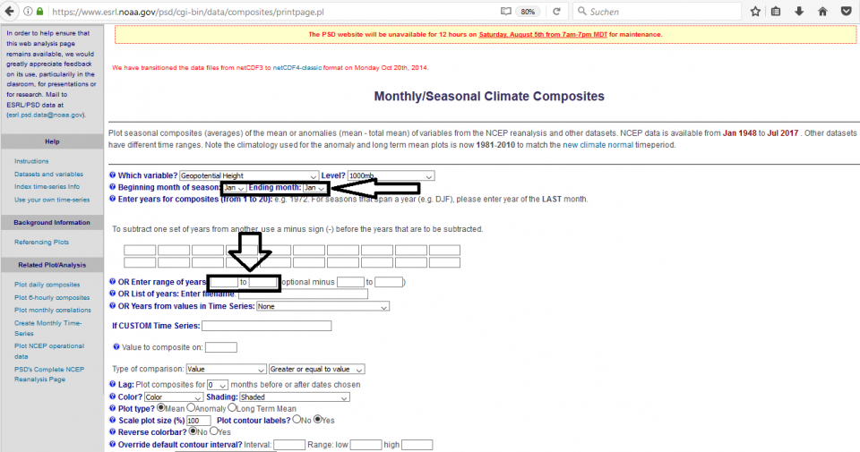 Wenn ich aber sage "plot mir den Zeitraum Mitte August bis September von den und den Jahren.", dann muss ich das ja taggenau eingeben, also Link ist nur fuer registrierte User sichtbar. registrieren oder login. benutzen. Und da kann ich nur das letzte Jahr angeben ("year of last day of range"), aber nicht das erste. Ich kann mir wohl vorstellen, dass das mit den Kästchen oben geht, aber das weiß ich nicht genau, wie das geht. Vielleicht kannst du mir da helfen. Mir geht's ja in diesem Thread insbesondere um die Zeit nach den 7 Wochen Siebenschläferzeitraum, ab Mitte August, darauf wollte ich eigentlich hinaus.