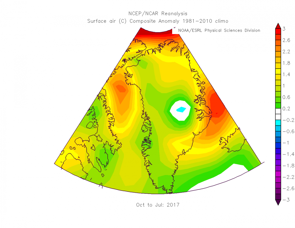 Dann bleibt nur noch die entscheidende Frage, warum sich über Grönland eine so wirksame kühle Luftmasse eingestellt hat. Das sollte eigentlich schon seit etwa Oktober 2016 nachweisbar sein (wir reden dann von 10 Monaten), denn dann begannen die vermehrten Neuschneemengen (Frosted Hurricane war der Beginn, wenn man so will) und die wurden noch ausgebaut und dann bis heute erhalten. El Nino oder besser der Abbau der Wärme aus El Nino kann dafür nicht herhalten, wir sind ja immer noch nicht auf dem alten Niveau angekommen. Wo kommt die Kälte her oder was hat Grönland (isoliert??) so kühl bleiben lassen? Wetter allein fällt raus, dafür ist die Zeitspanne schon deutlich zu lang.