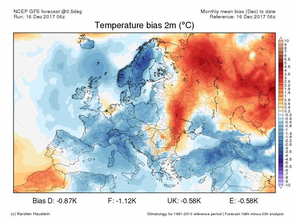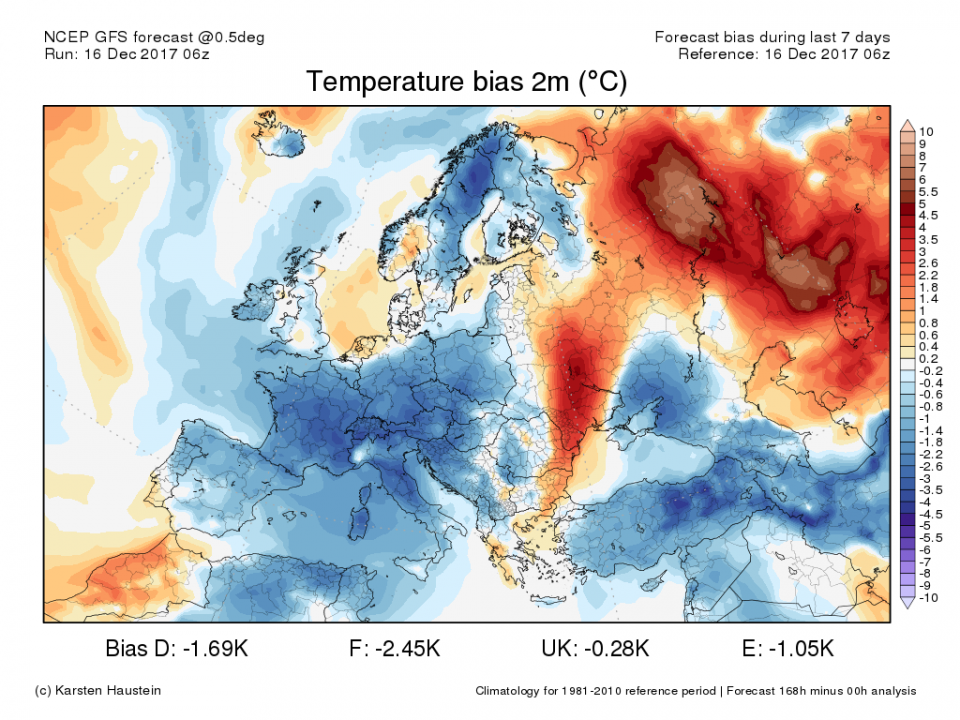 Allerdings von Einsturz der Hüpfburg kann keine Rede sein. Die Bodentemperaturen stehen mit den Druckverhältnissen in Abhängigkeit. Kleine Abweichungen können große Wirkung erzielen. Und -1,7 Grad und mehr Differenz bundesweit in nur 7 Tagen sind schon große Abweichungen, da ja schließlich die ersten drei Tage als fast sicher bezeichnet werden können. Wenn dann also diese Differenzen in den nachfolgenden 4 Tagen entstehen, dann kann dies ohne andere Druckverhältnisse nicht geschehen. Statt Vorderseite dann Rückseite z.B. oder statt milderem Westwetter dann kälterem Nordwest- oder Nordwetter. Das sind die "Kleinigkeiten", die dann die Fehlprognose ausmachen für einen Stichtag oder sogar für eine Phase, wie hier bei 7 Tagen-Differenzen. Und wenn die Sprünge in den Läufen dann extrem von a nach b hopsen, dann kann es auch mal an die -5 Grad heranreichen und wird erst weniger, wenn die Sprünge sich relativ angleichen oder ausgleichen. Zwar ist Deutschland ja nur klein und damit als regionale Abweichung akzeptabel, aber wenn es diese Abweichungen (und höhere) auch in größeren Regionen gibt oder sogar in Regionen so groß wie Europa, dann erkennt man daran ja unzweifelhaft, dass die gesamte Großwetterlage der vergangenen 7 Tage ohne große Eintreffquote berechnet wurde. Und die Abweichungen zur tatsächlichen Temperatur war ja bei uns weiß Gott nicht die höchste, wie man hier sehen kann:
