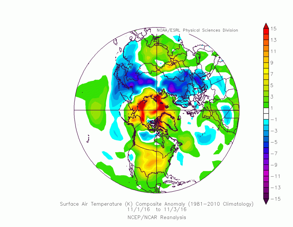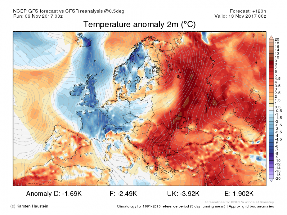 Und dann kommt der Knackpunkt: das nachrückende kalte Hoch von den Azoren nach Skandinavien. In diesem Bereich sinkt die Höhenkaltluft des Wintereinbruchs ab und in der Höhe erwärmt es sich. Es muss zumindest kurzzeitig zu einer wirklichen Azoren-Grönland-Hochdruckbrücke kommen. Nikolaus 2013 war im Ansatz gut, aber die Hochdruckbrücke wurde vom Atlantik her durchstoßen, plattgebügelt mit Regen und auch in Skandinavien floss einfach zu viel Warmluft ein mit großflächigem Tauwetter: