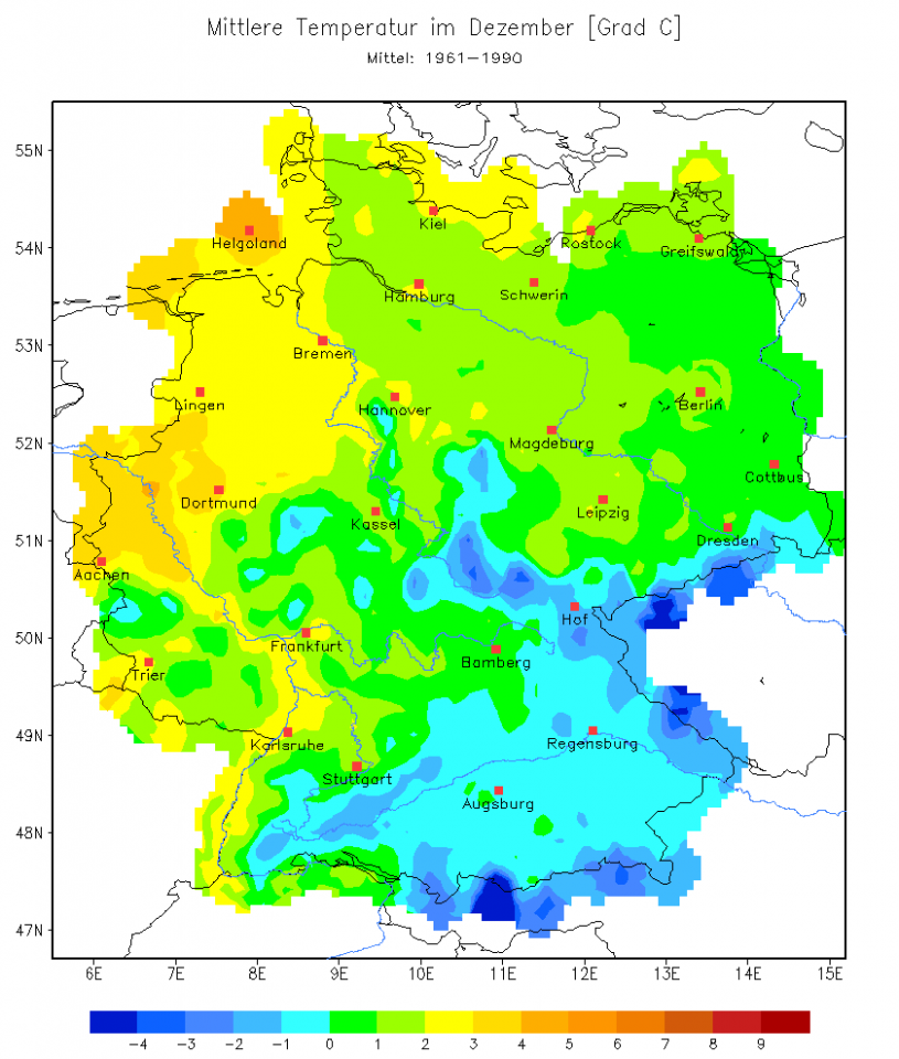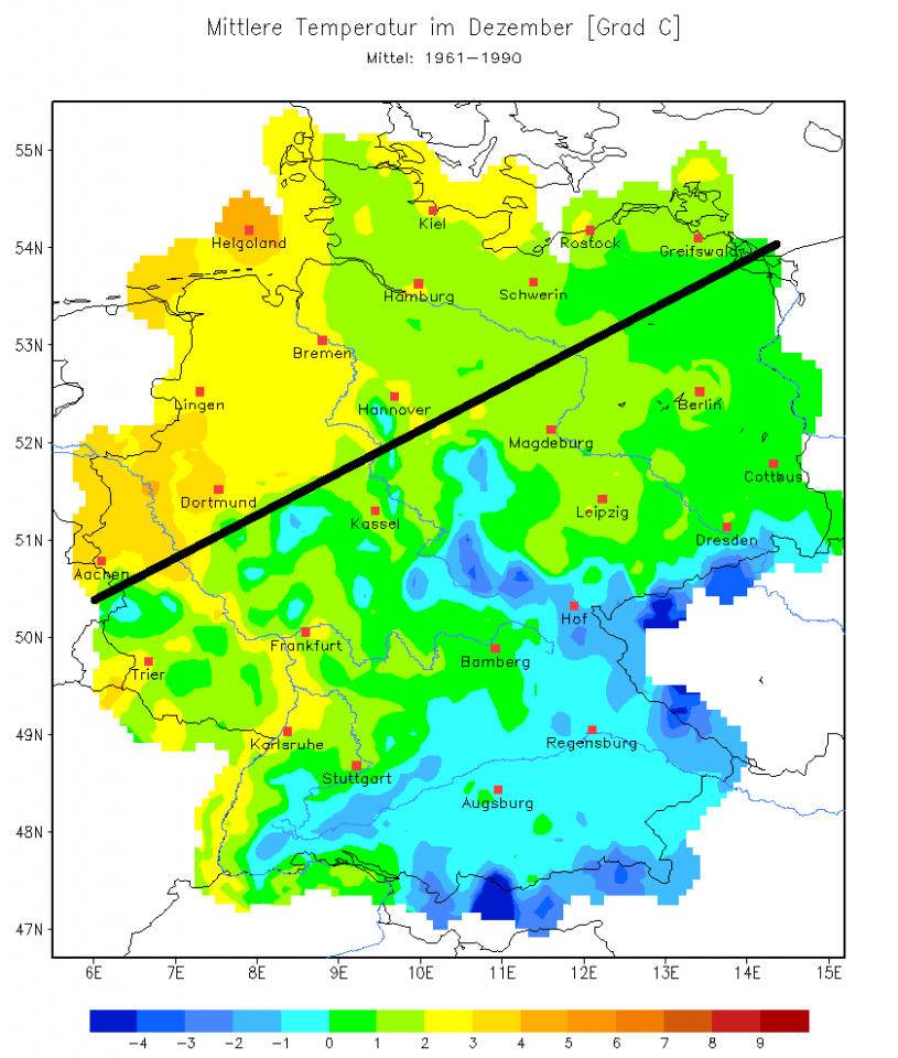 Wir stellen fest: Trotz aller Wärme in der Nordsee ist ne Nordlage eine kalte Wetterlage, spätestens ab der Mittelgebirgsschwelle südwärts. Und da wird's interessant, denn die Durchschnittstemperaturen im Dezember sind dann doch in diesen Gebieten um 0°C, ebenso in Teilen von Brandenburg und Sachsen. Ja, die Grafik zeigt jetzt die Durchschnittswerte von 61-90, für die vorige Grafik 81-10 addiere man 0,4k, dann sieht die Karte auch nicht viel anders aus: