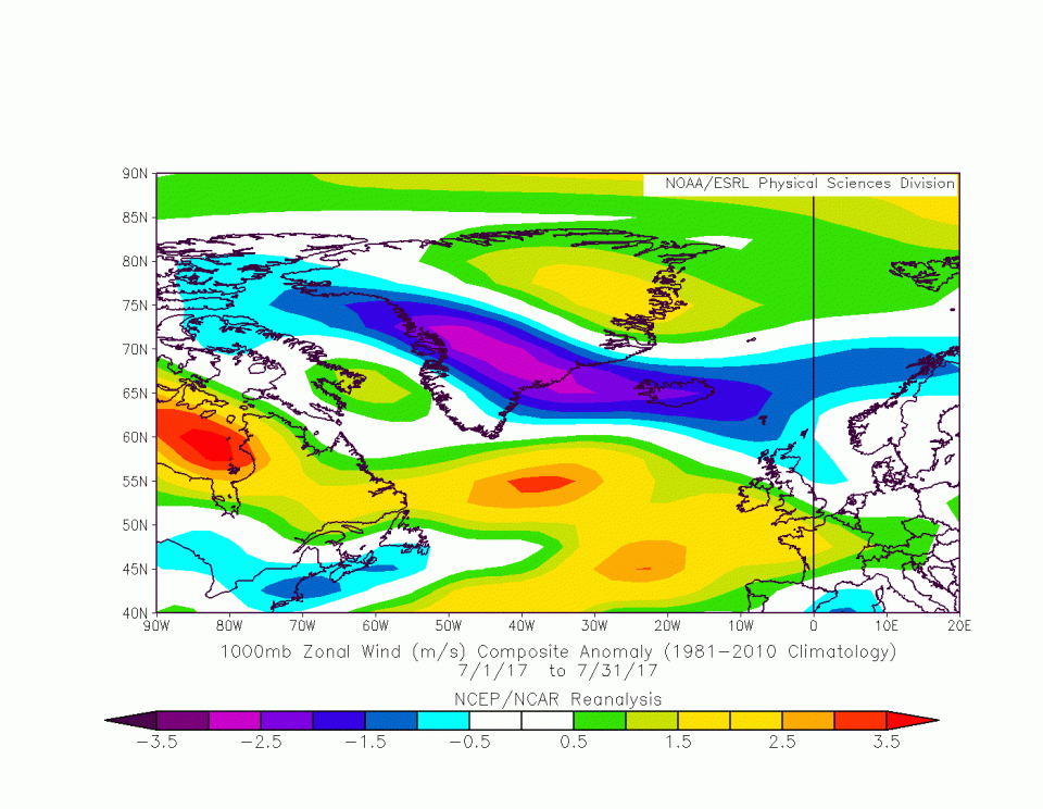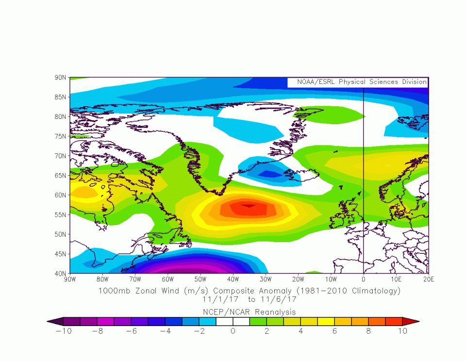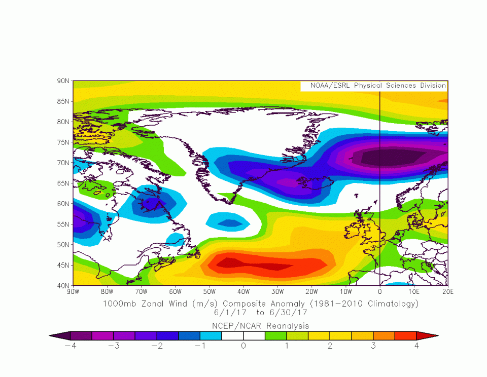 So'ne Tiefdruckzone wird immer von Randtiefs umkreist, diese nehmen immer etwas Kaltluft von der Rückseite mit auf die Vorderseite. Jetzt braucht aber so'n Tief auf seiner Vorderseite Warmluft. Das heißt, es muss immer weiter östlich fischen gehen. Das nennt man West-Ost-Zirkulation.