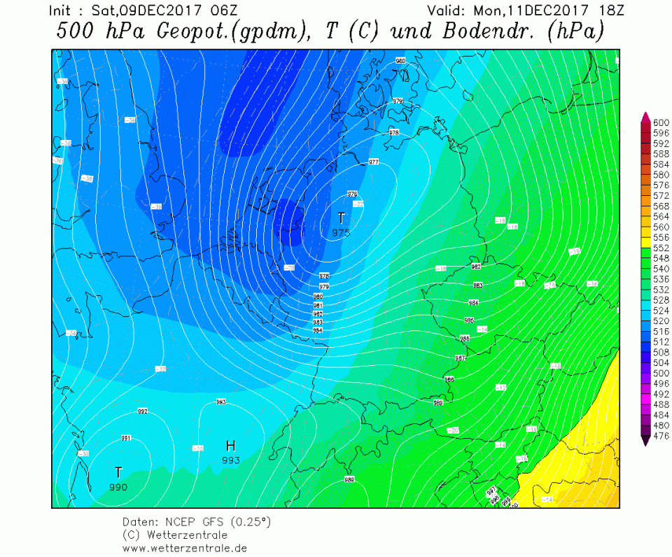 GFS zeitg das Tief ziemlich zentral über Deutschland nordostwärts ziehend, somit