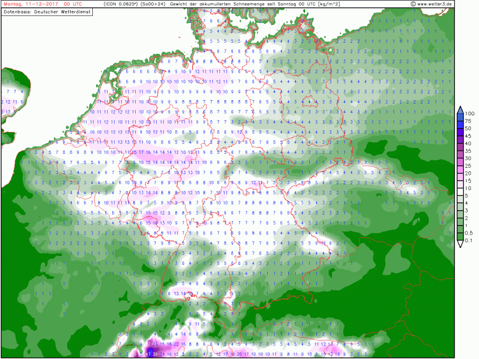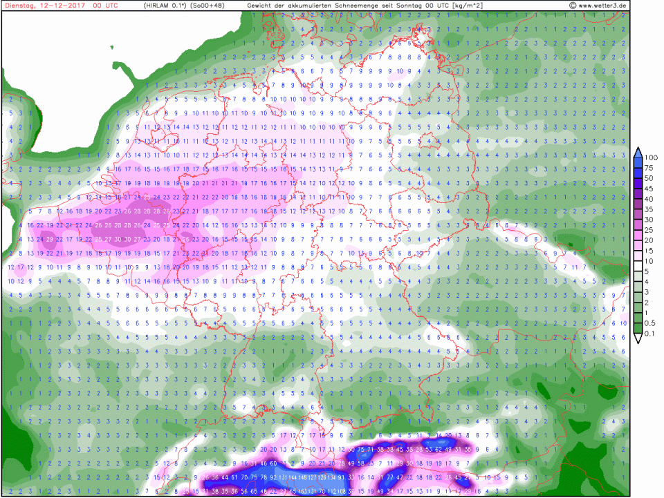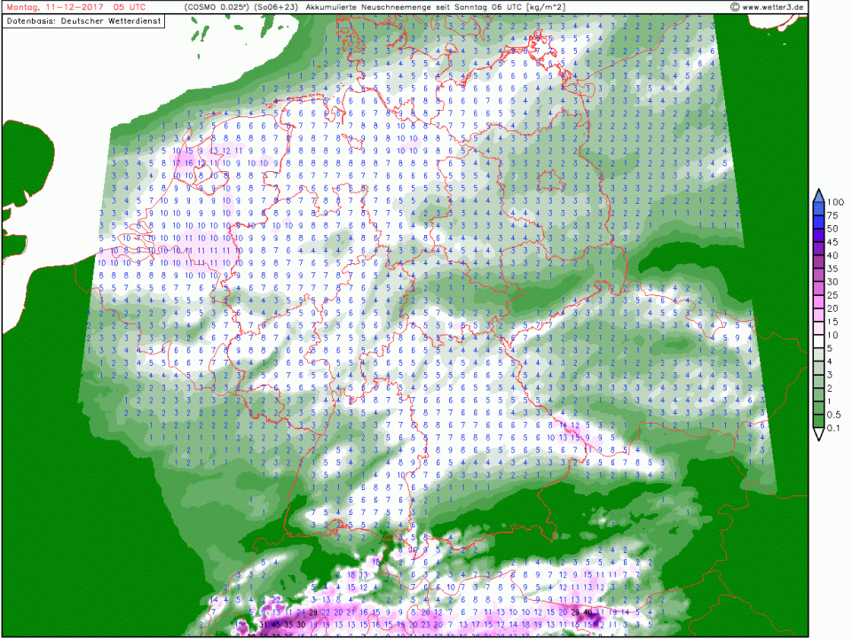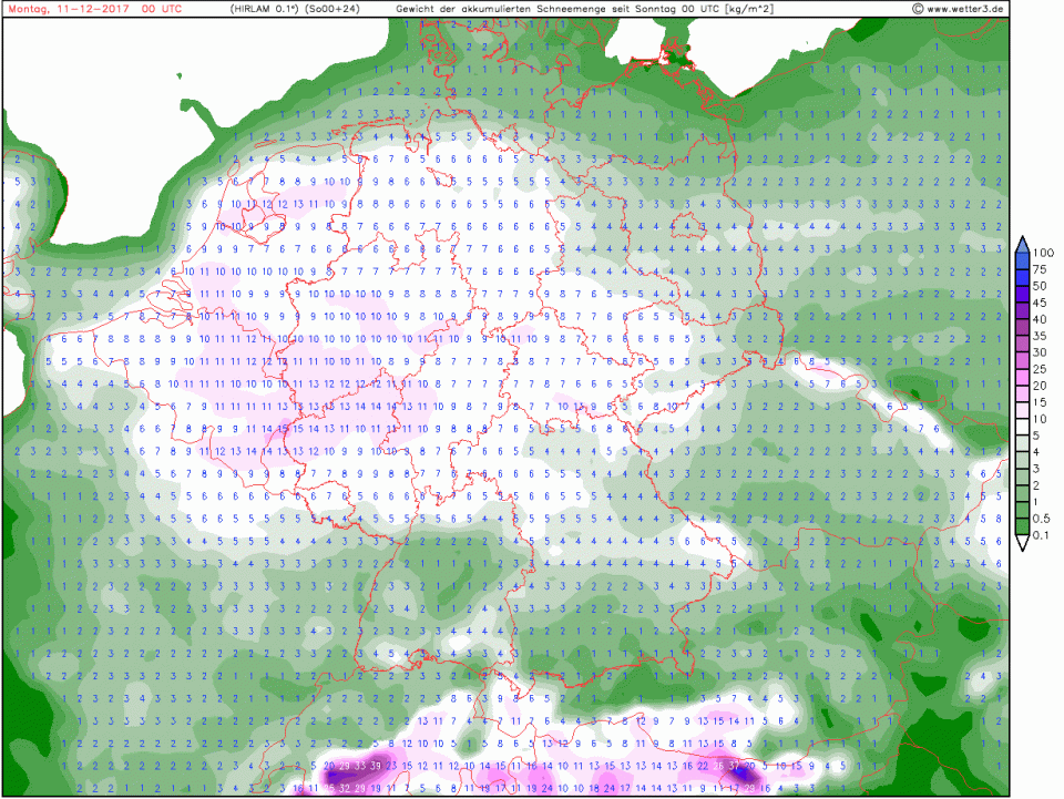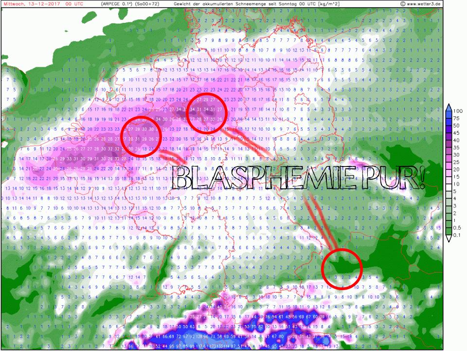 Ach übrigens Warmfront... also die, die jetzt vor unserer Haustür steht. Das hier sind die berechneten Neuschneemengen (Liter pro Quadratmeter als Schnee) bis heute Nacht 1 Uhr, erste Karte 6 Uhr, nicht dass jemand überrascht wird.