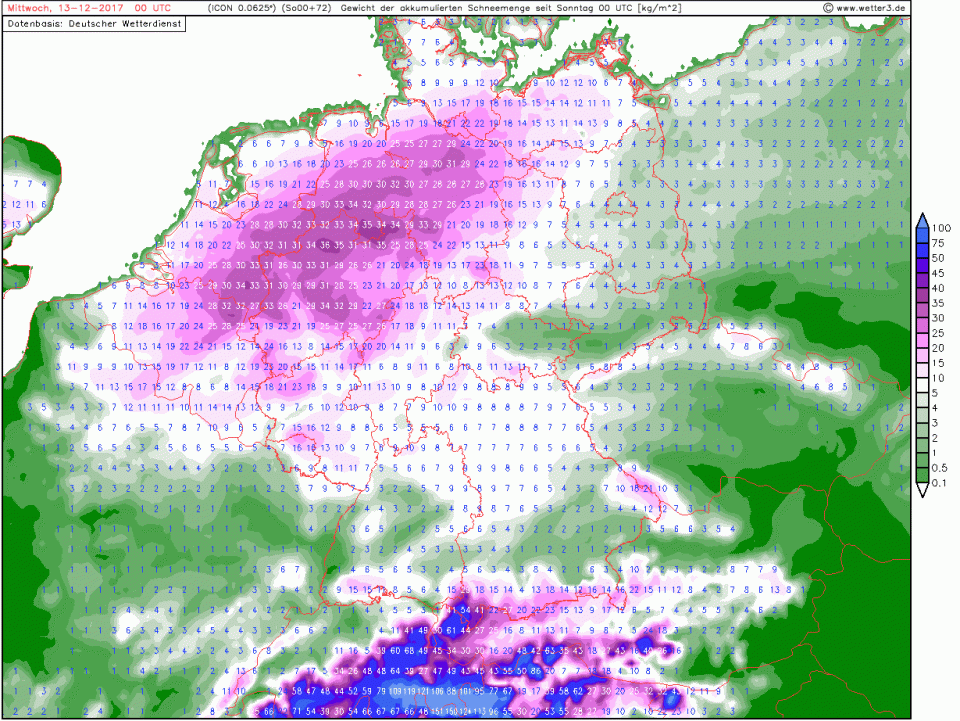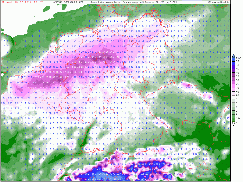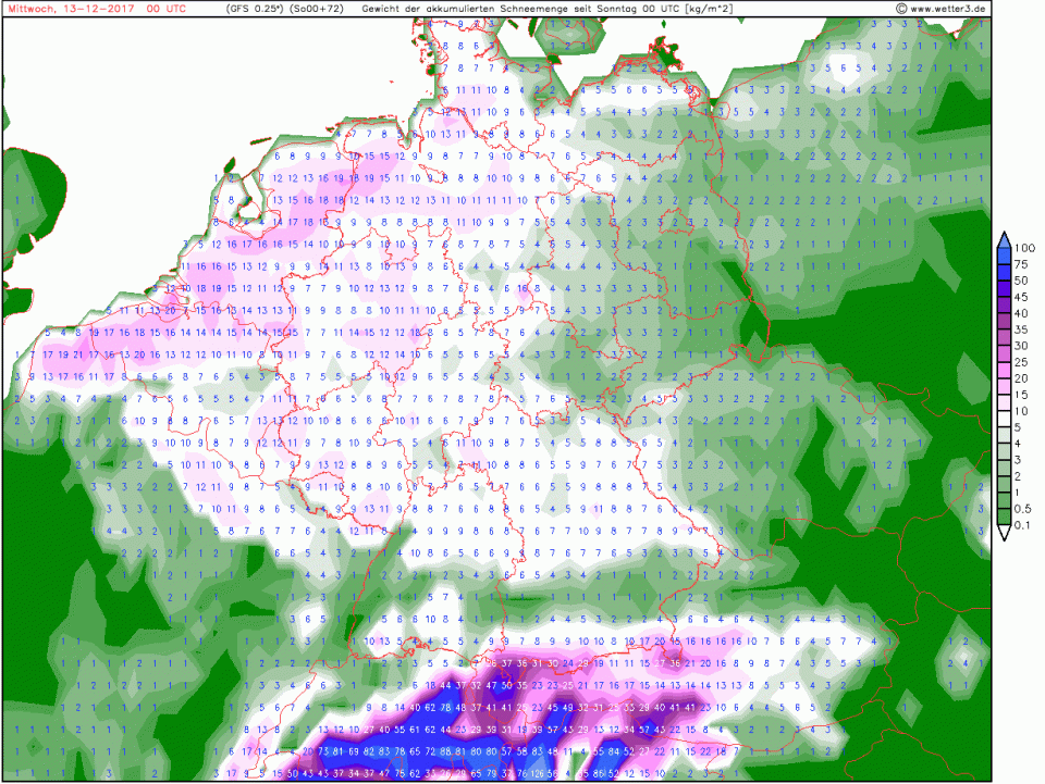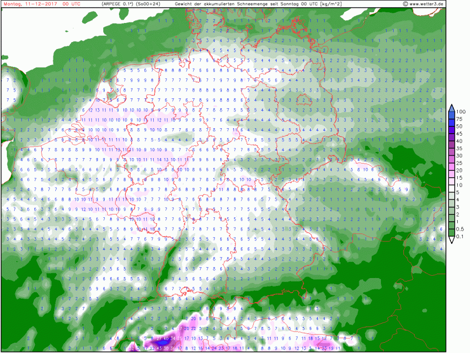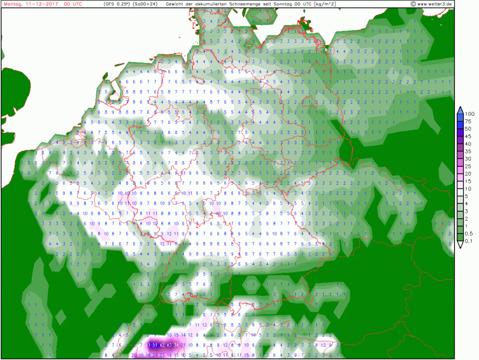 Ach übrigens Warmfront... also die, die jetzt vor unserer Haustür steht. Das hier sind die berechneten Neuschneemengen (Liter pro Quadratmeter als Schnee) bis heute Nacht 1 Uhr, erste Karte 6 Uhr, nicht dass jemand überrascht wird.