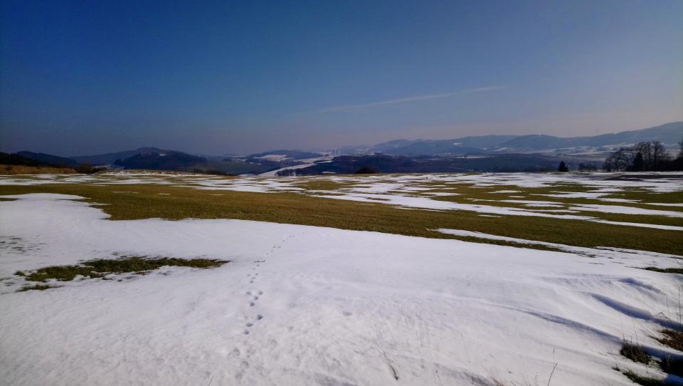 Takt 0,8°C, 2/8 bewölkt, Tmax 4,5°C. Nach wie vor Schneefelder bis 7cm Höhe.