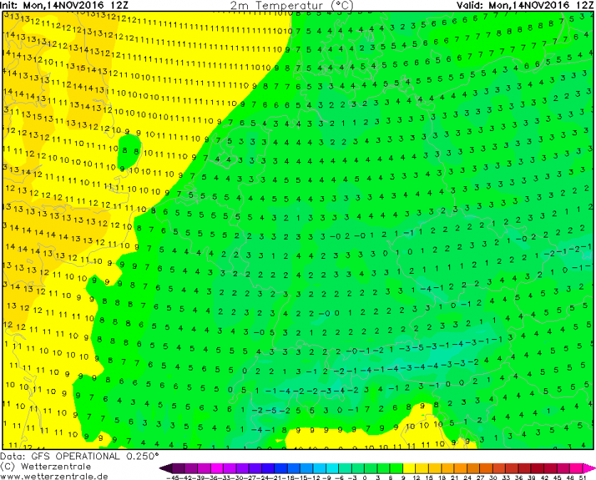 Bei der Einspeisung werden IMMER Fehler gemacht, hier vergleich mal beim GFS12z Hauptlauf die Temperaturen zur Stunde 0 (=12UTC bzw. 13Uhr MEZ)...