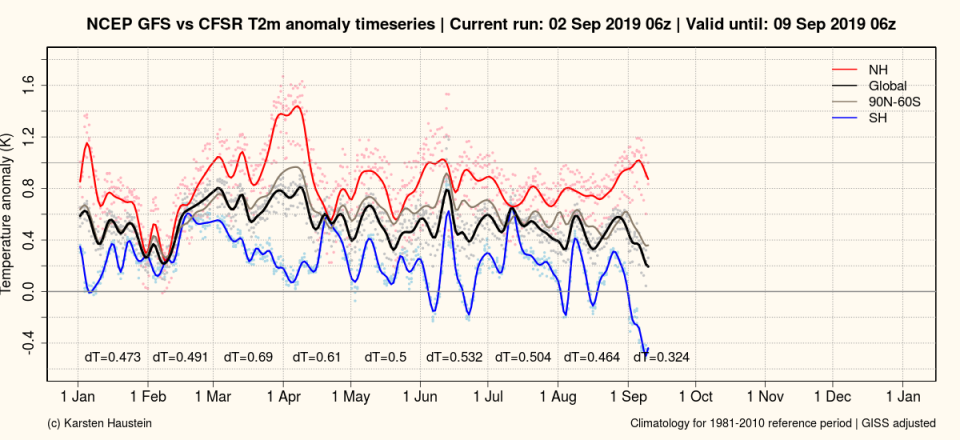 Doch es gibt einen Grund, warum ich das gerade heute hier berichte. Bei Haustein/GFS gibt es mal wieder einen regelrechten Absturz der für die nächsten 7 Tage berechneten Temperaturen auf der Südhalbkugel. Es ging gestern schon bis zu - 0,7°C runter, heute noch bis -0,5°C. Hier der aktuelle Lauf: