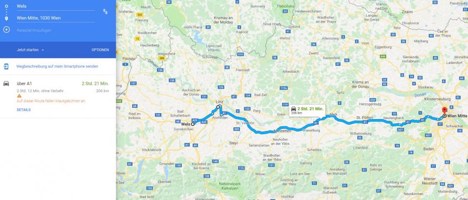 Von mir zu Hause (in der Nähe von Wels in Oberösterreich) nach Wien sind's ziemlich genau