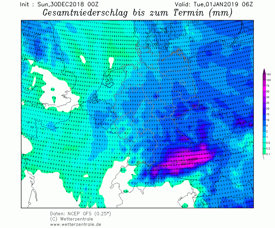 Vor allem im Osten und Süden gibt es weitere, meist aber nur leichte Niederschläge (1 bis 5 mm, Erzgebirgsstau auch darüber) in Form von Regen oder Nieselregen bis in höchste Lagen. Lediglich an den Alpen ist nach Osten zu aufgrund des Staus mit höheren Mengen zu rechnen. ICON-EU simuliert im Chiemgau und Berchtesgadener Land in Staulagen 15 bis 20 mm, GFS weitet diese Mengen