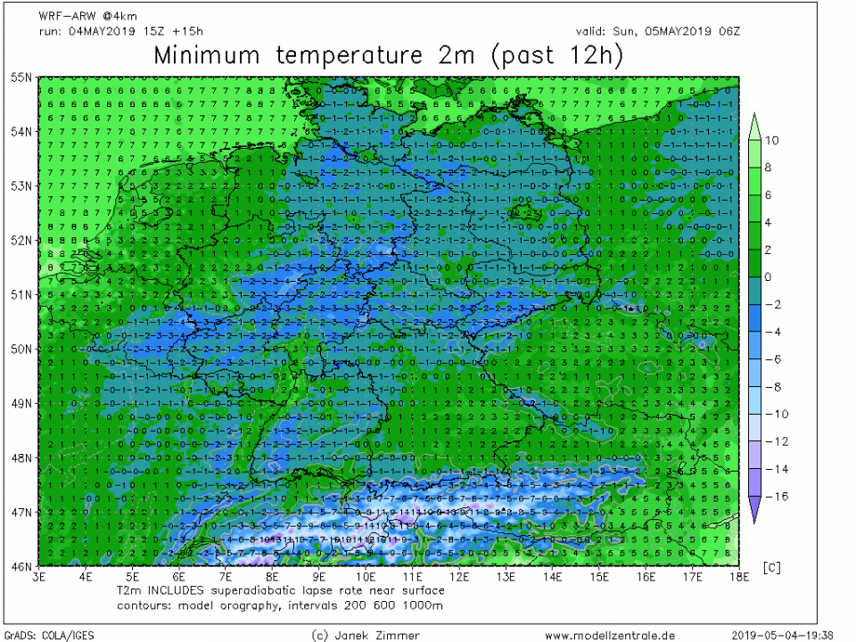 Hier auf 440 m gabs zuletzt vor 13 Jahren eine dünne Schneedecke, aber unter 1 cm hoch. Eine Schneedecke von 6 cm im Mai gabs hier seit meinem Messbeginn imJahr 1995 noch garnie. Auf Bäumen, Holzbrettern usw. hatte es teils auch mehr als 6 cm !
