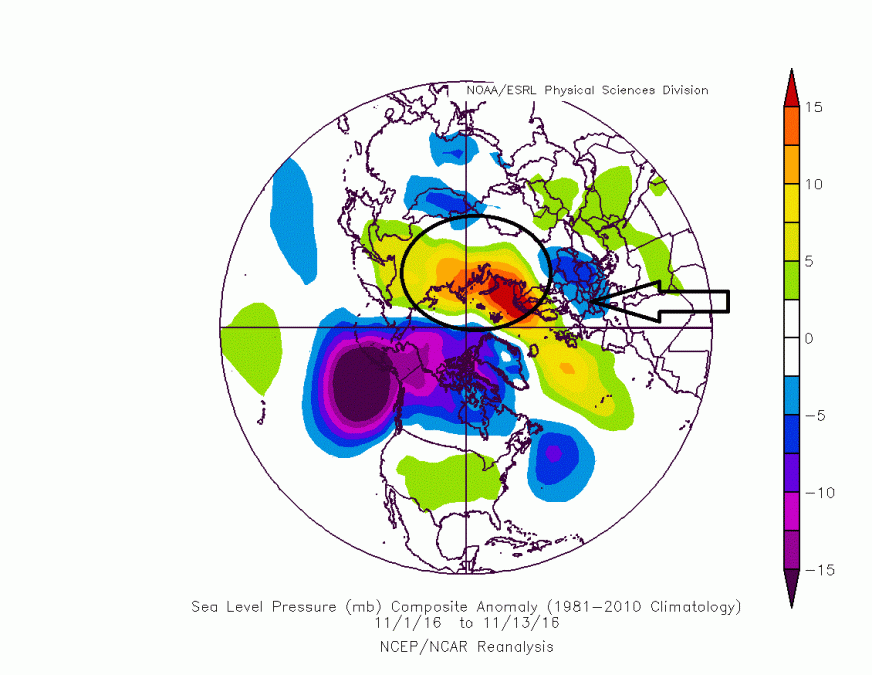 Die aktuellen Berechnungen sehen im Norden des Kontinents im Vergleich zu den Jahren von 1982 bis 2010 nur noch einen durchschnittlichen Winter 2016/2017. Bild: NOAA