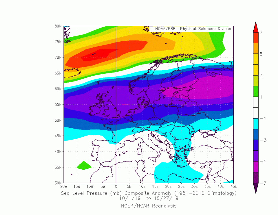 3) Bisher gab es diesen Oktober weder eine Neigung zu Vorderseiten noch zu Subtropenhochs. Wir haben allgemein etwas zu tiefen Luftdruck (die blauen Farben) mit Schwerpunkt Baltikum/Russland. Also östlich von uns, Rückseite: