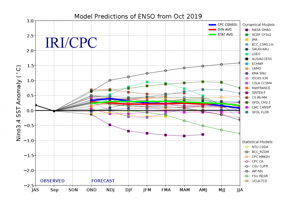 4) Erstens haben wir im Moment keine el-nino-Bedingungen (sondern Anomalien von knapp unter 0 im letzten 3-Monats-Mittel). Und zweitens wird zwar ein Anstieg vorhergesagt, aber der soll laut den meisten Modellen knapp unterhalb der el-nino-Schwelle von +0,5k bleiben: