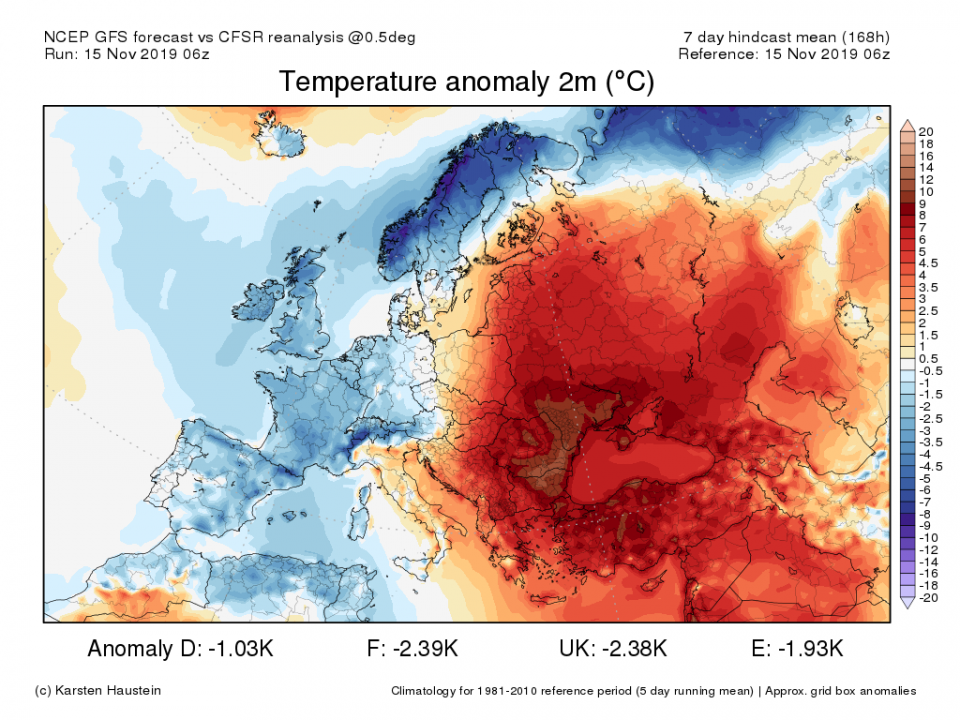 Während Westeuropa seit Tagen halbwegs frühwinterliches Wetter erlebt, war es in Osteuropa teils noch spätsommerlich: