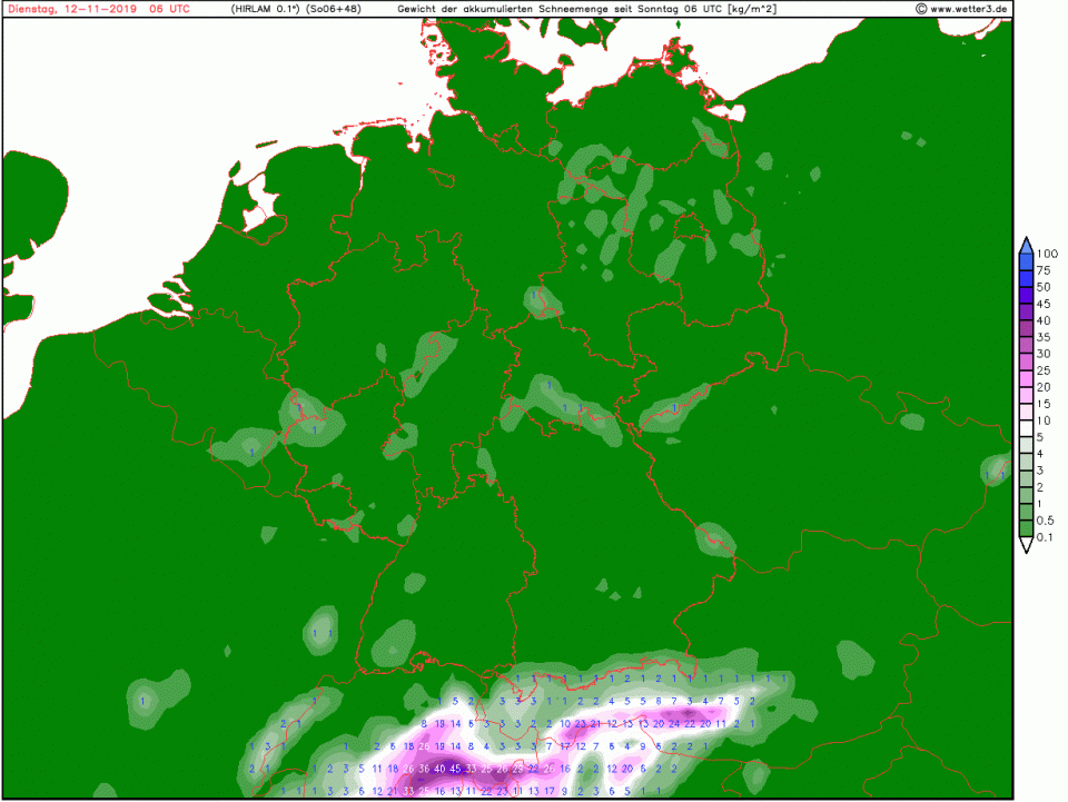 Ein Tief zieht schon in den nächsten Stunden durch die Mitte Deutschlands. Also zur Info: Hellblau bedeutet Schneefallgrenze 600-800m, Lila 300-400m: