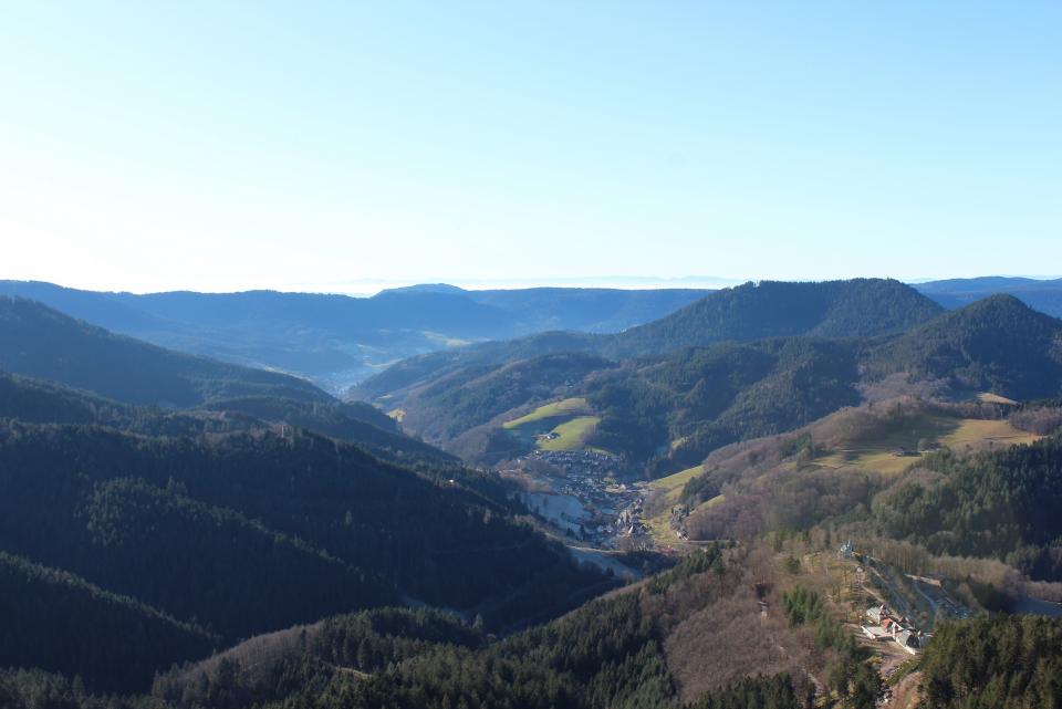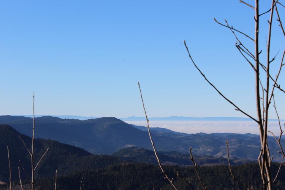.Gestartet bin ich auf dem Kniebis auf 935 m. Höhe (im Moment leider komplett schneefrei), bin dann entlang des Westweges Richtung Lettstädter Höhe gewandert. Unterwegs gibt's immer wieder fantastische Ausblicke in das darunter liegende Renchtal, die völlig im Nebel liegende Rheinebene und im Hintergrund die Vogesen.