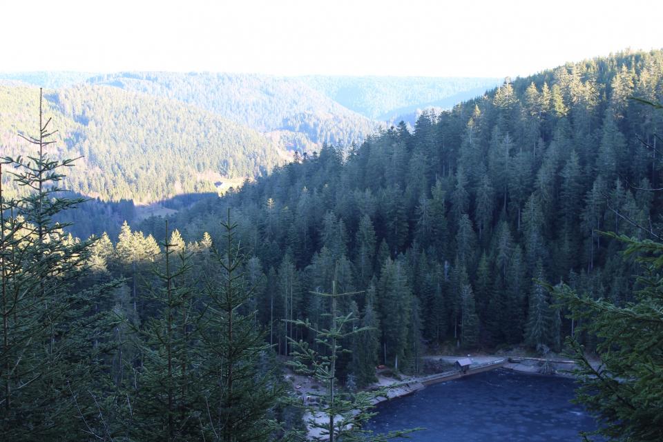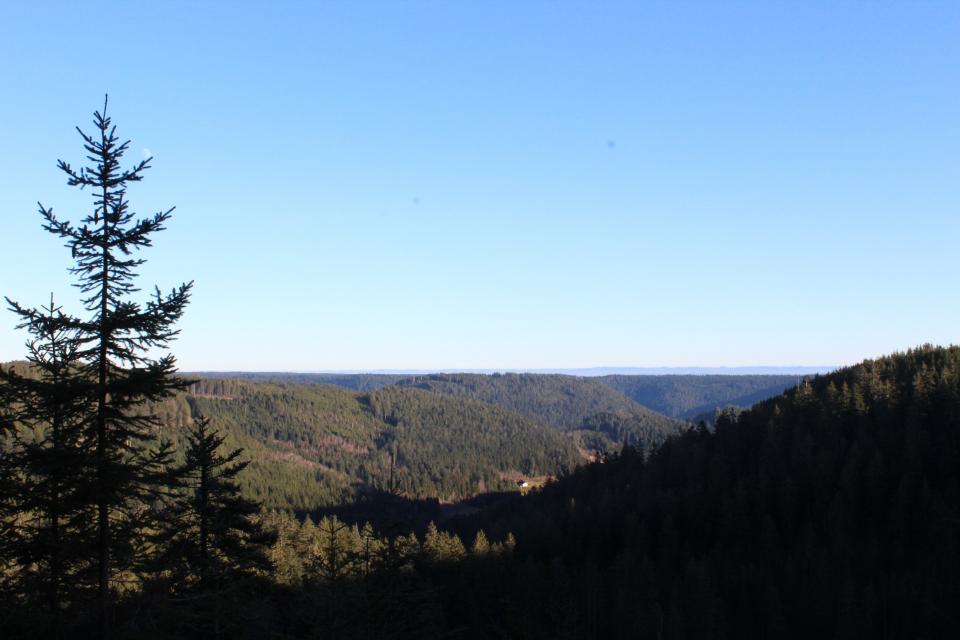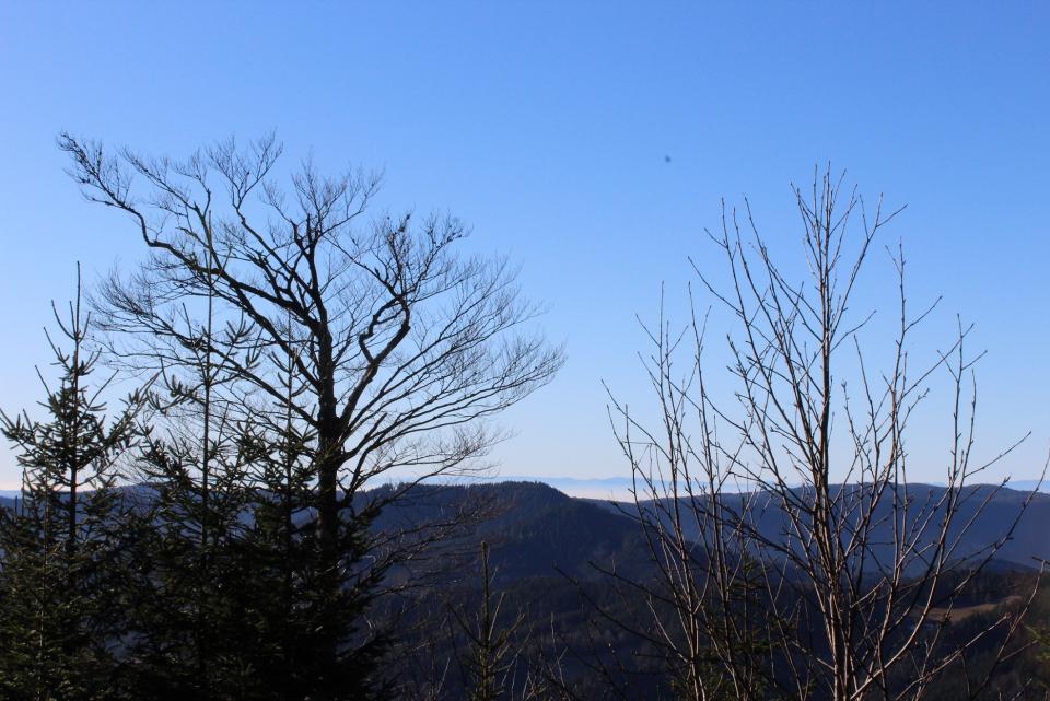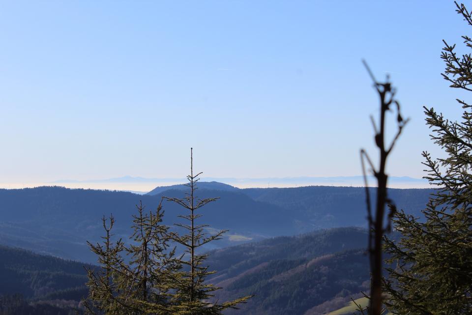Gestartet bin ich auf dem Kniebis auf 935 m. Höhe (im Moment leider komplett schneefrei), bin dann entlang des Westweges Richtung Lettstädter Höhe gewandert. Unterwegs gibt's immer wieder fantastische Ausblicke in das darunter liegende Renchtal, die völlig im Nebel liegende Rheinebene und im Hintergrund die Vogesen.