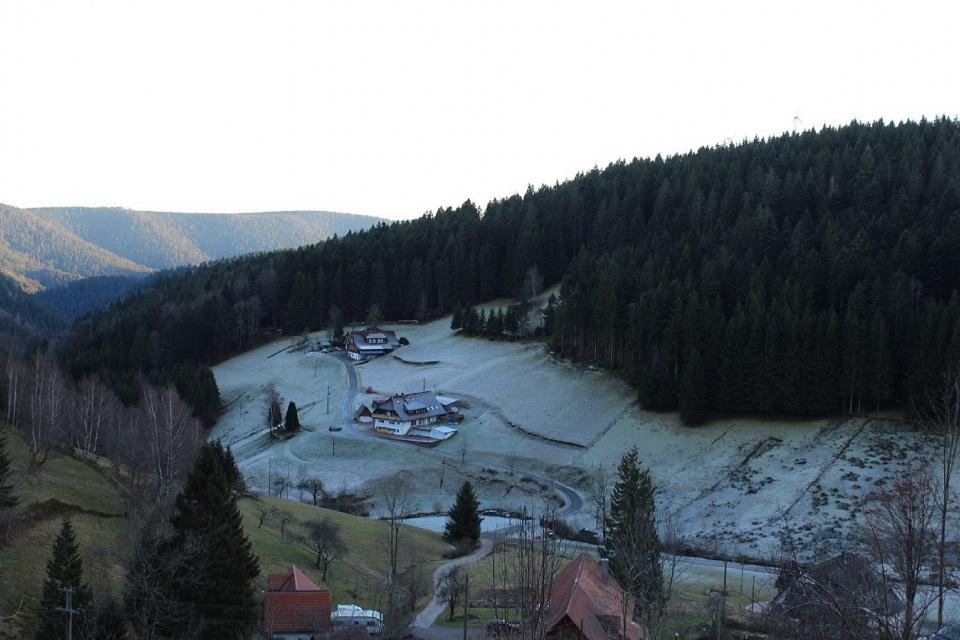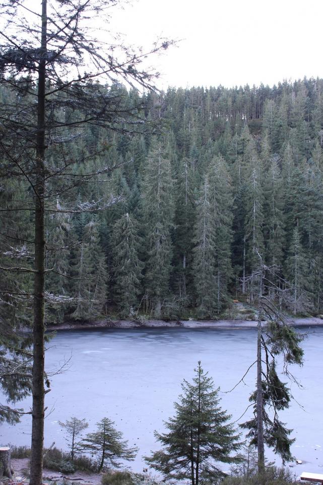 . Der See heizt sich trotz einer Meereshöhe von 850 Meter durch die dunkle Färbung des Wassers im Sommer sehr schnell auf. Das liegt an dem hohen Moorgehalt des Wassers , deswegen leben auch keine Fische im Glaswaldsee.Und zum Schluss noch ein Foto von mir Zuhause ins 4km lange Seitental Glaswald auf 750 Meter Höhe. Hier sieht man auch deutlich die Unterschiede von Sommer und Winterseite, ich gehöre zu den glücklichen und wohne auf der Sonnenseite