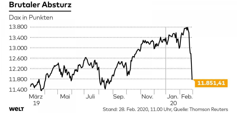 Hunderte Containerschiffe können nicht beladen werden, die chinesische Produktion läuft nur noch auf Sparflamme. Das Virus breitet sich weltweit aus und verursacht Schockwellen an den Börsen. Nach dem ungeheuren Allzeithoch vor kurzem brechen die Kurse regelrecht ein. Die Weltwirtschaft rutscht in eine Rezession (allein China machte bisher 50% des weltweiten Wachstums aus, jetzt wird Chinas Wirtschaft schrumpfen). Das wirkt dann nach und nach auf alle Volkswirtschaften. Heute hat es auch den DAX erwischt: