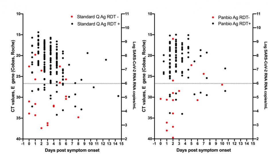 Die roten Punkte unter der gestrichelten Linie bewertet man so, das der Antigentest negativ anzeigte, die Menschen sehr wohl infiziert waren, aber die Virusmenge zu gering sein sollte, um andere Menschen anstecken zu können. Es kann sein, wenn man den Test zu einem anderem Zeitpunkt machen würde, das dann ein anderes Ergebnis herauskommt, also der Mensch dann z.B. infektiös geworden ist.