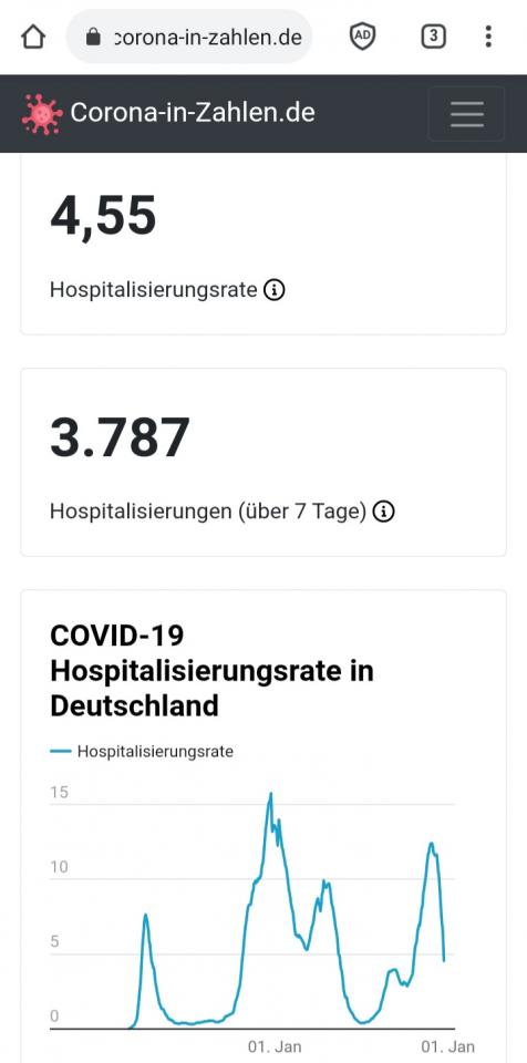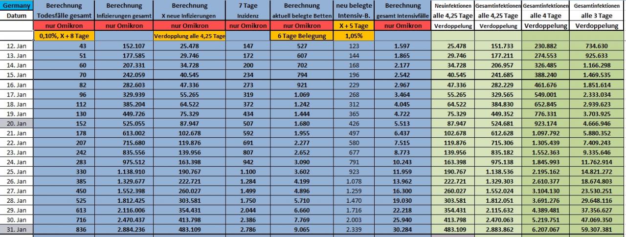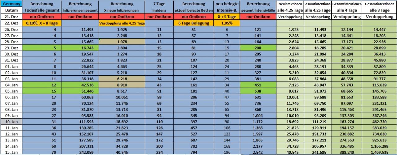 Gestern Abend habe ich die neuesten Zahlen vom RKI und weitere Erkenntnisse ausgewertet und in meine Hochrechnung für die nächsten Wochen eingepflegt. Es ist festzustellen, dass sich das Omikron-Virus etwas schneller in Deutschland vermehrt, als ich es noch vor ein paar Tagen hochgerechnet hatte. Alle 4,25 Tage findet jetzt eine Verdoppelung der Infektionszahlen statt. Die Hospitalisierungsrate liegt aktuell bei 1,05% der Neuinfizierten mit einem Verzug der Hospitalisierung von 5 Tagen ab Infizierung (statt 1,00% aus der bisherigen Berechnung). Die Belegungszeit der Betten liegt weiter bei durchschnittlich 6 Tagen, was recht kurz ist und anzeigt, dass die Schwere der Erkrankungen niedriger ist als bei den Varianten zuvor. Aber die Todesfallzahl liegt höher als bisher erkennbar war, sie liegt jetzt bei 0,1% der Gesamtinfektionen mit einem Verzug von 8 Tagen ab Infizierung (statt 0,05% aus bisheriger Berechnung). Die Werte werden sicher noch etwas variieren, aber mit den inzwischen recht stabilen Daten kann man schon ausreichend seriös eine neue Hochrechnung wagen, die hoffentlich nicht noch einmal nach oben korrigiert werden muss (nach unten wäre erfreulich). Hier nun die Berechnungen bis zum 15. Januar mit den bisherigen Daten. Ich habe zusätzlich die 7-Tage-Inzidenz nur Omikron eingepflegt (daraus wird erkennbar, wann Omikron mehr als 50% der Infektionen ausmacht (nehmt die tägliche Inzidenz aus den Medien und vergleicht diese mit der hier berechneten Omikron-Inzidenz, die 50% Omikron aller Infektionen werden in den nächsten Tagen überschritten werden) und rechts in den beiden äußeren Spalten als Vergleich eine Entwicklung mit einer Verdoppelung der Infektionen von 4,0 Tagen und von 3,0 Tagen. Das dient aber nur der Information!