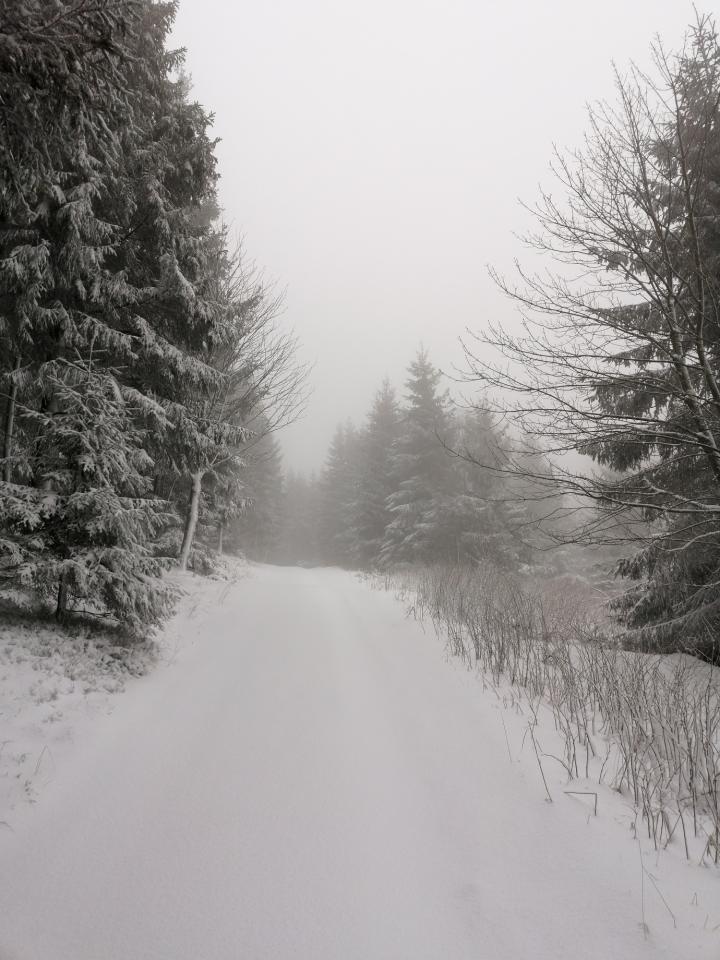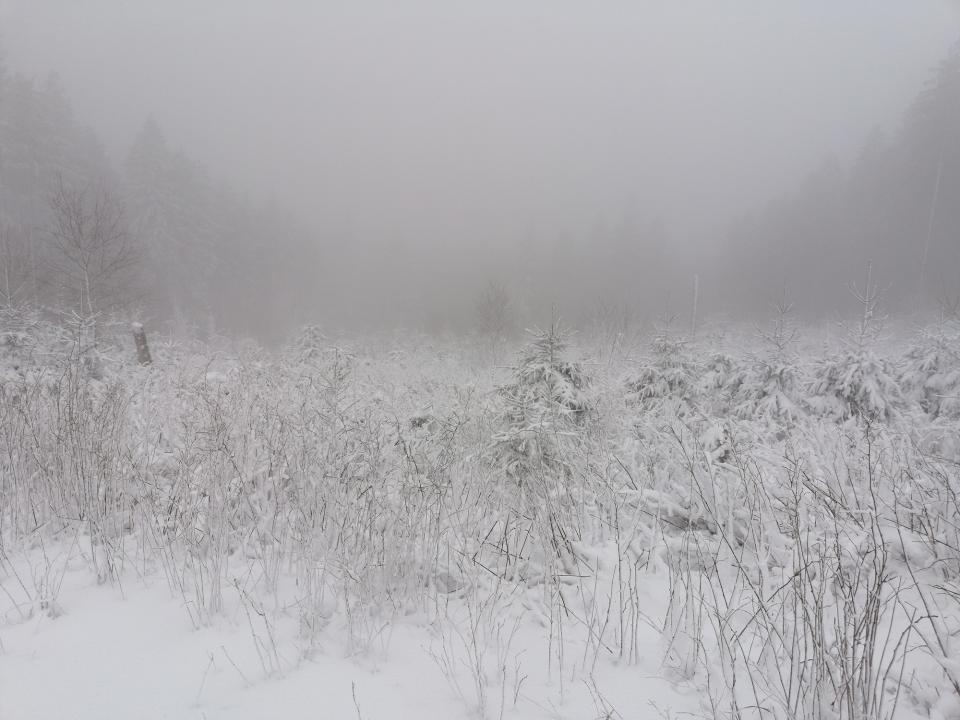 Von nun an ging's abwärts, wieder in den Bereich, wo der Schnee an allem festklebte: