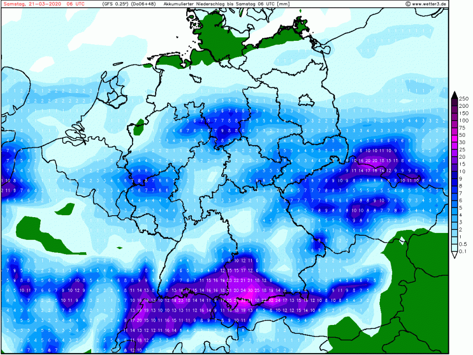 Tagesende erreicht sie etwa das nördliche Süddeutschland. Postfrontal sinken in T850 hPa die Temperaturen auf 0 Grad an der Mainlinie und bis -8 Grad auf Rügen. Mit der Front gehen erneut nur leichte Regenfälle einher, die hauptsächlich die Mitte betreffen.