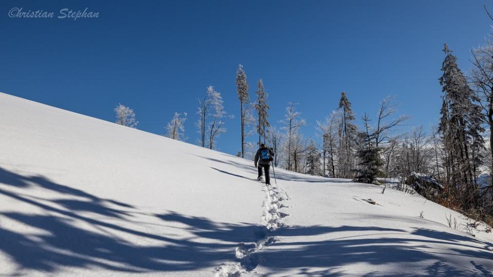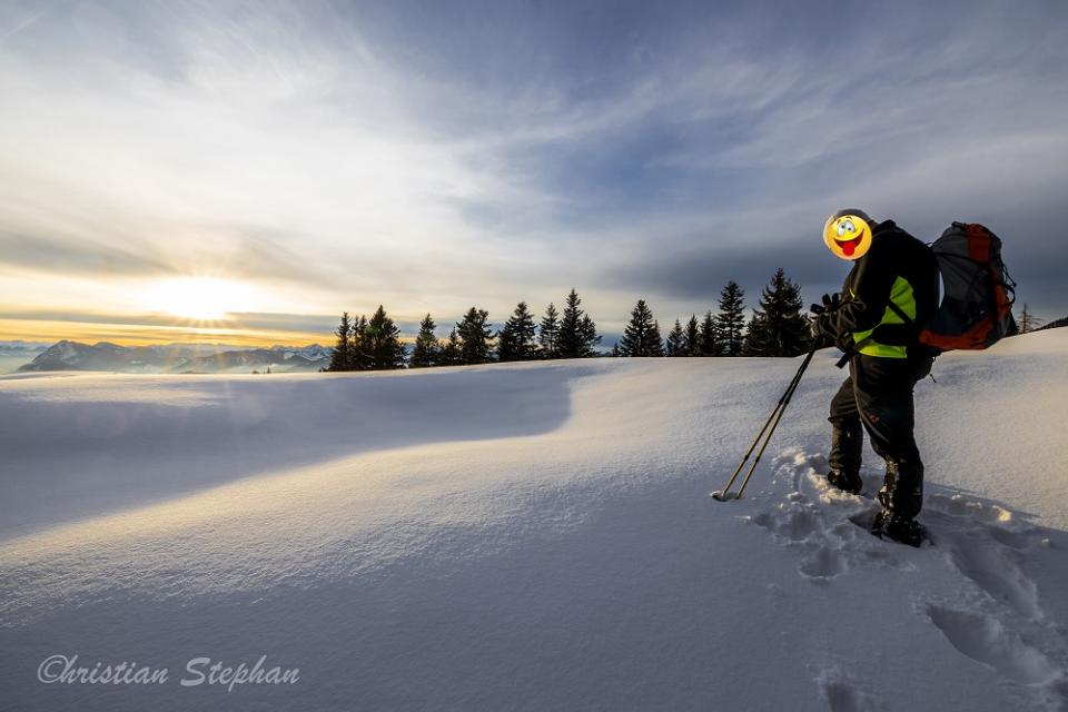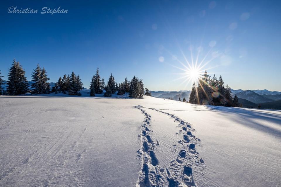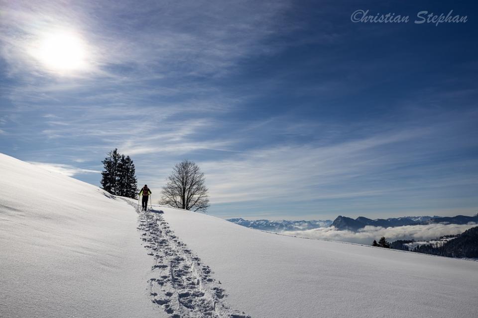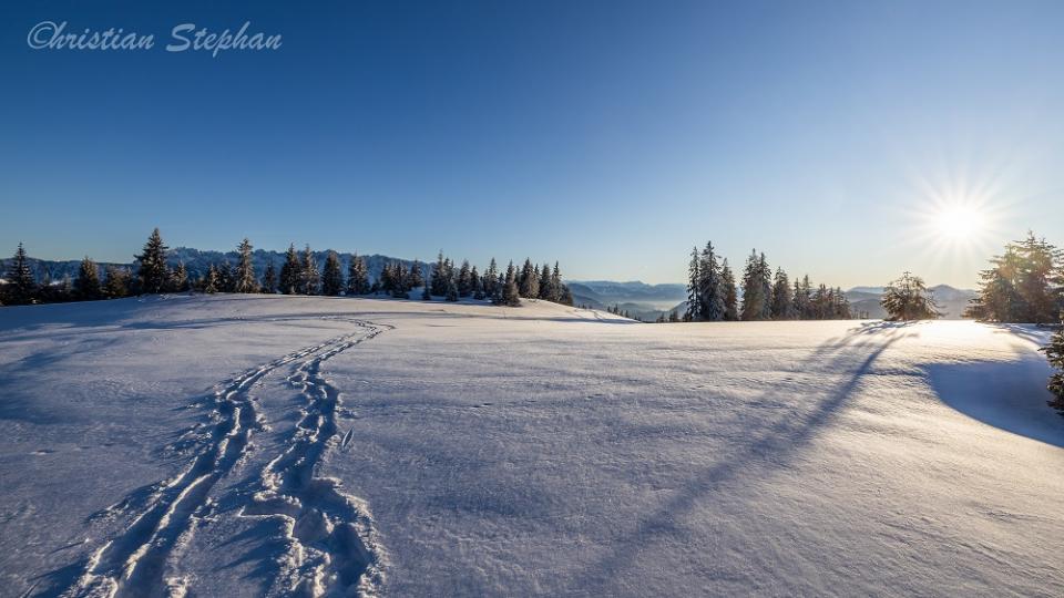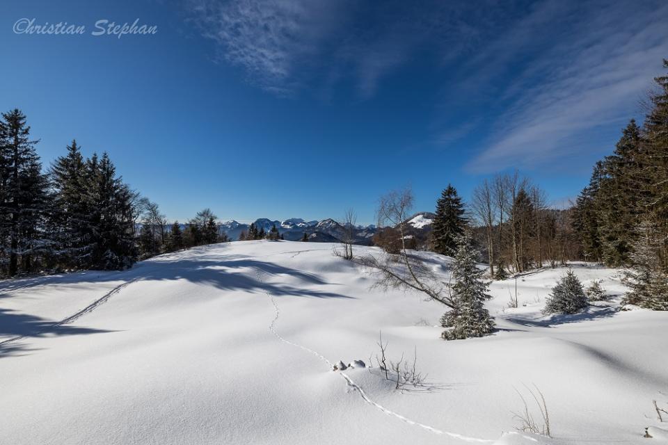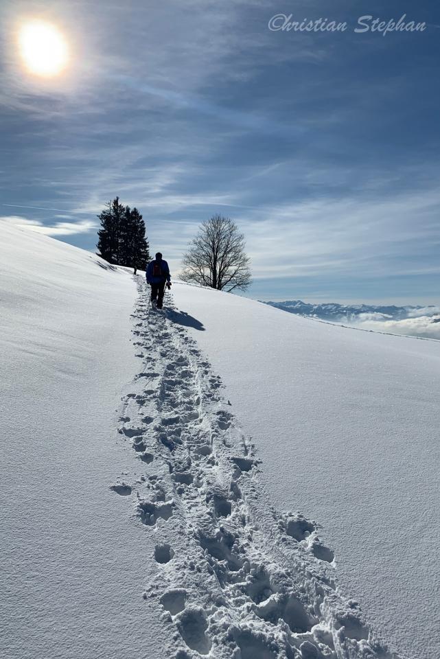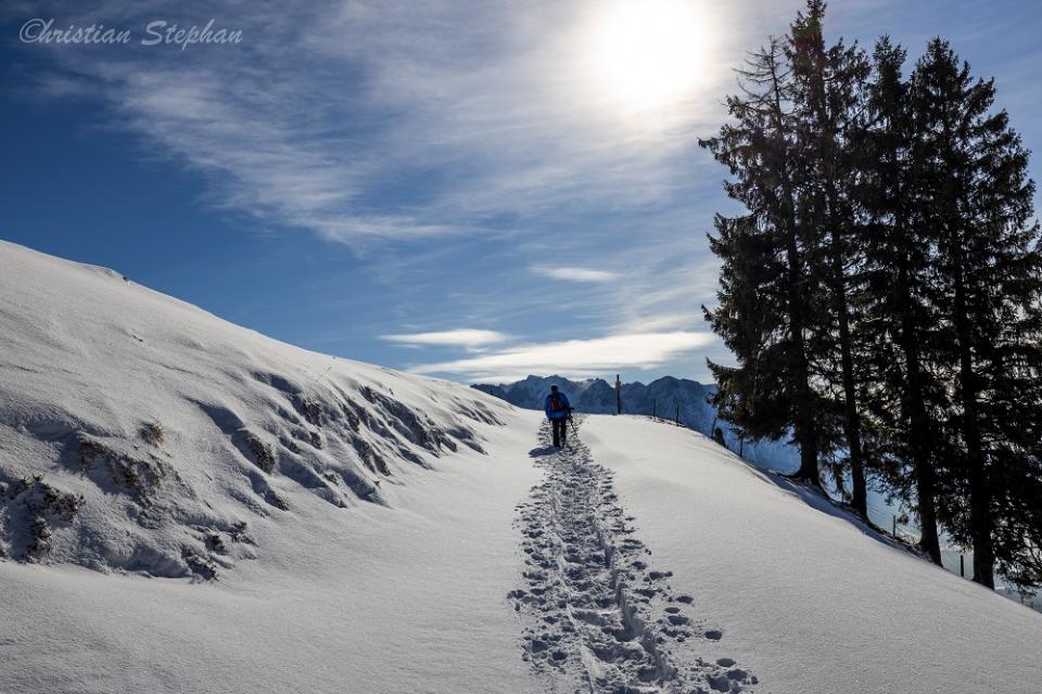 Nachdem ich mich durch dieses Schneemalheur gekämpft hatte, wackelten der Wettergucker und meiner einer entlang der Südhänge am Rettenschöss über weiße Bänder der Sonne entgegen:
