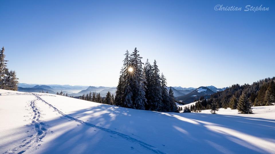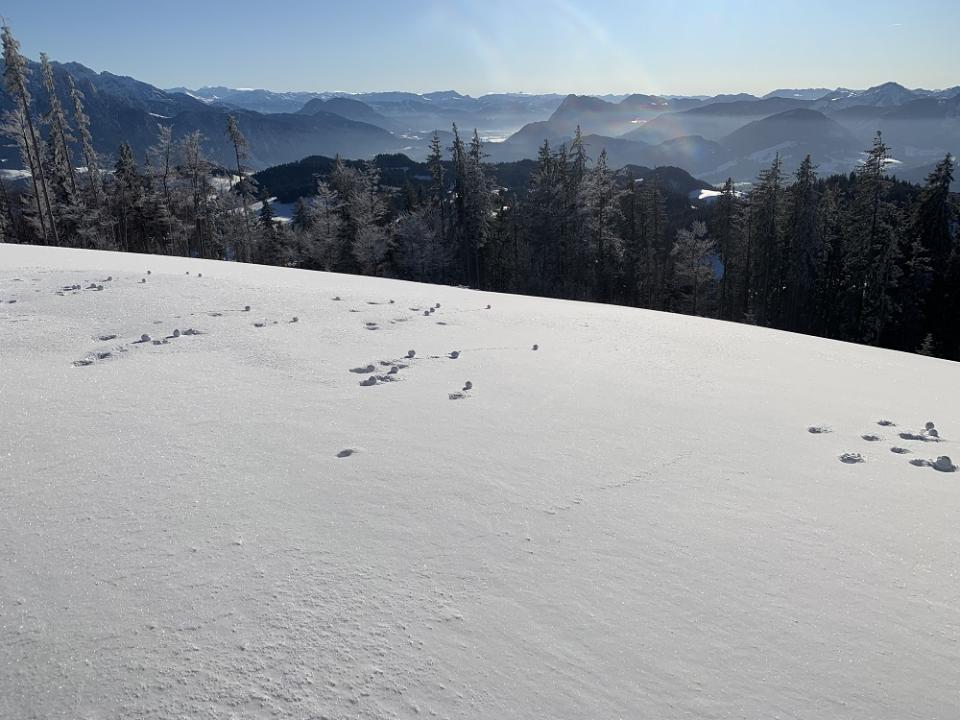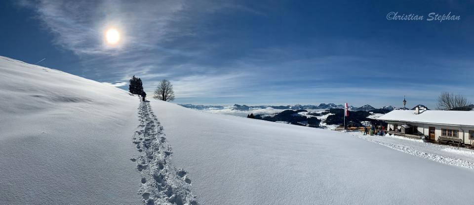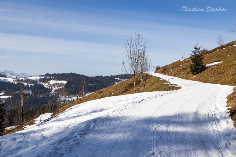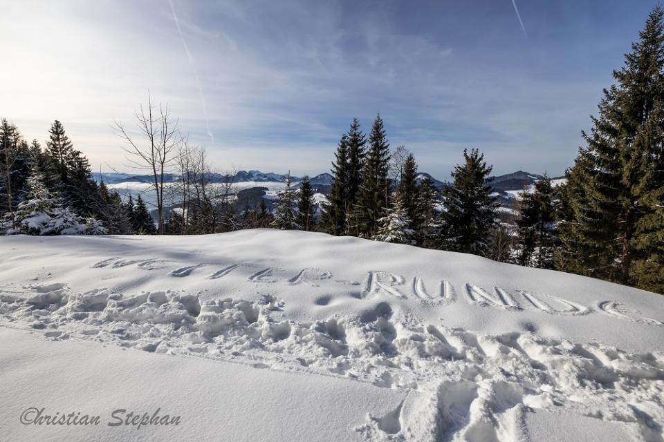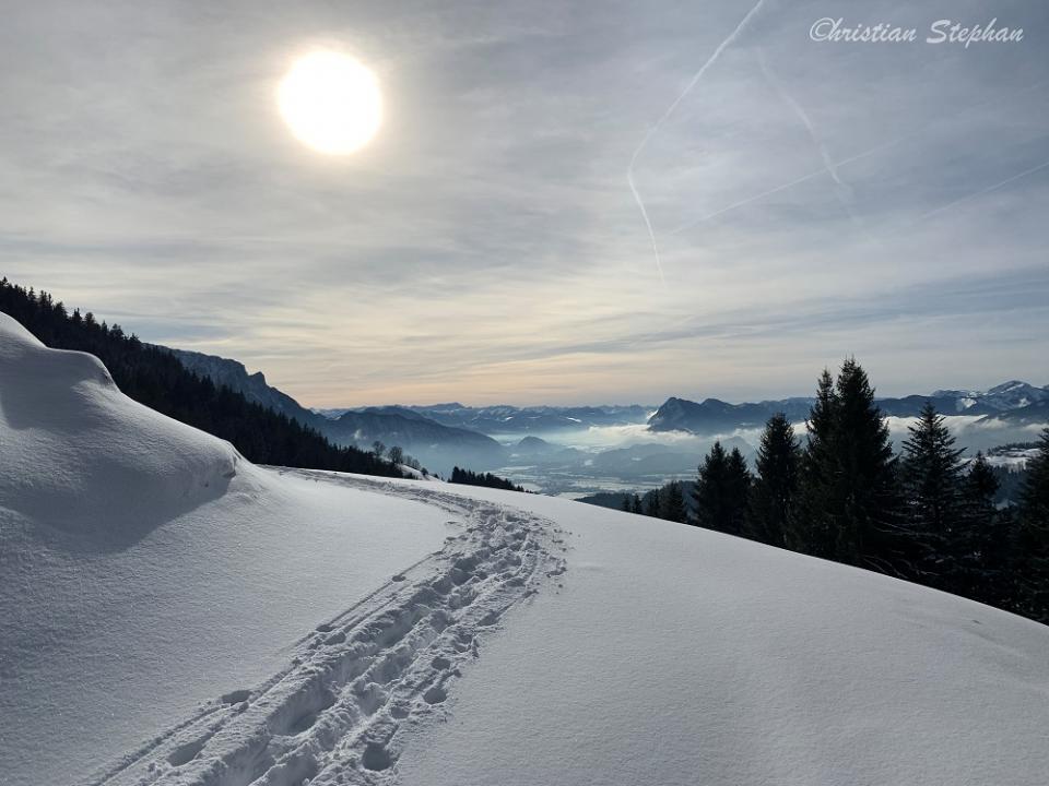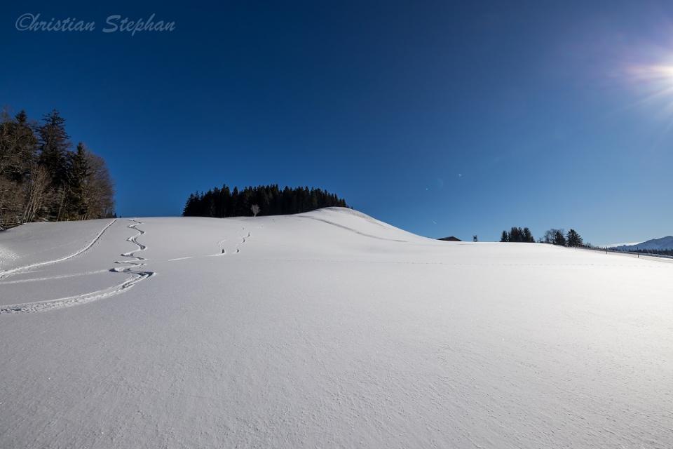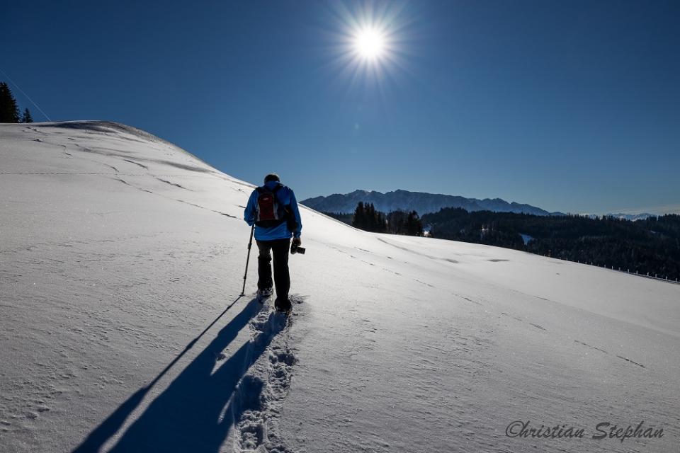 Nachdem ich mich durch dieses Schneemalheur gekämpft hatte, wackelten der Wettergucker und meiner einer entlang der Südhänge am Rettenschöss über weiße Bänder der Sonne entgegen: