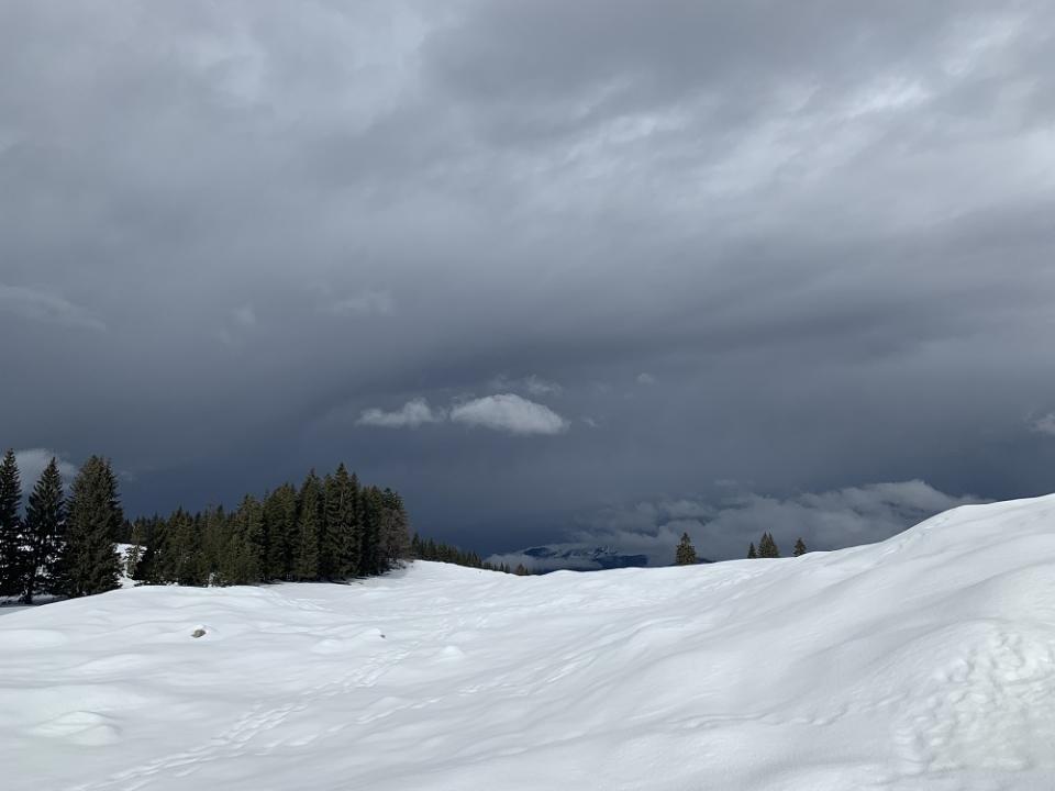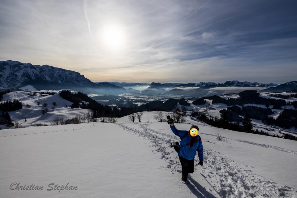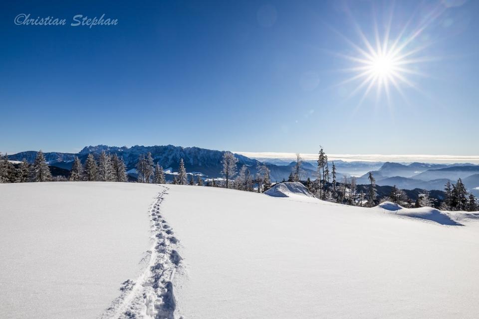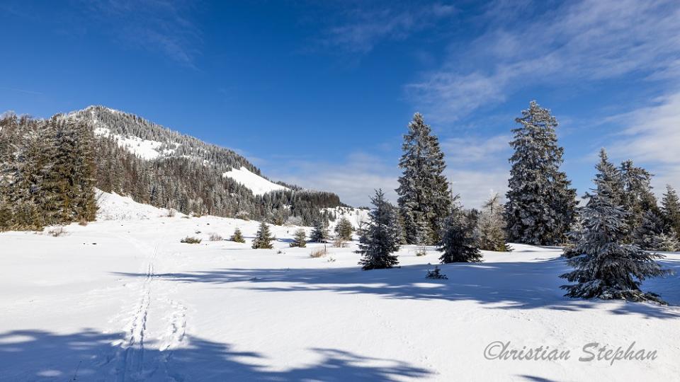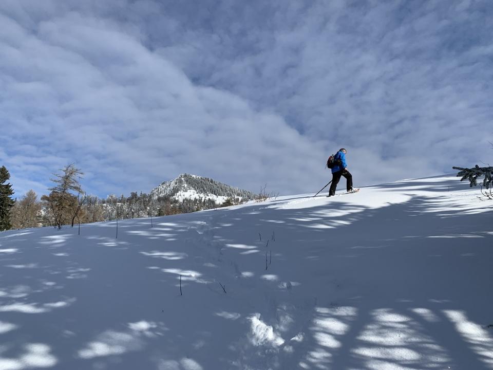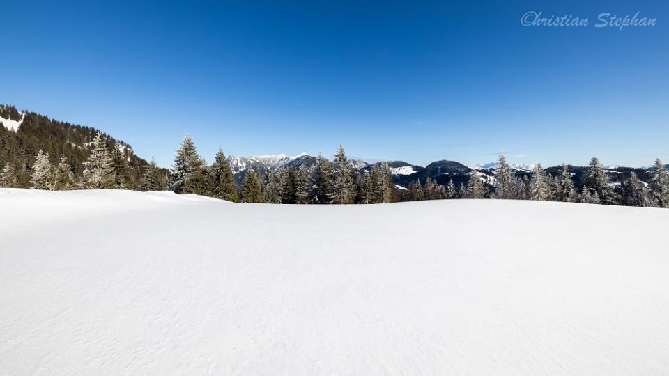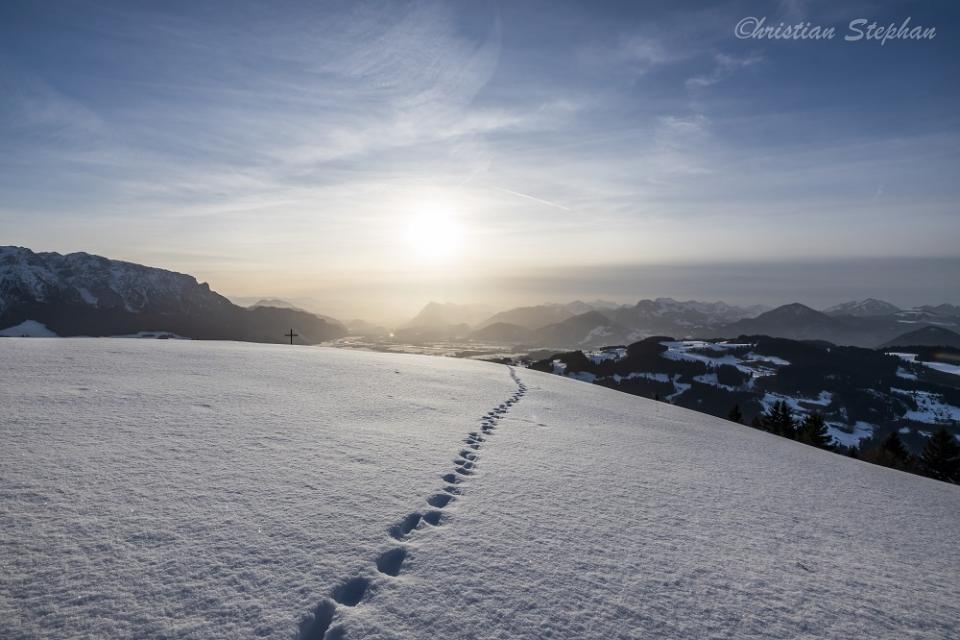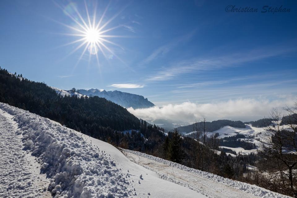 Nachdem ich mich durch dieses Schneemalheur gekämpft hatte, wackelten der Wettergucker und meiner einer entlang der Südhänge am Rettenschöss über weiße Bänder der Sonne entgegen: