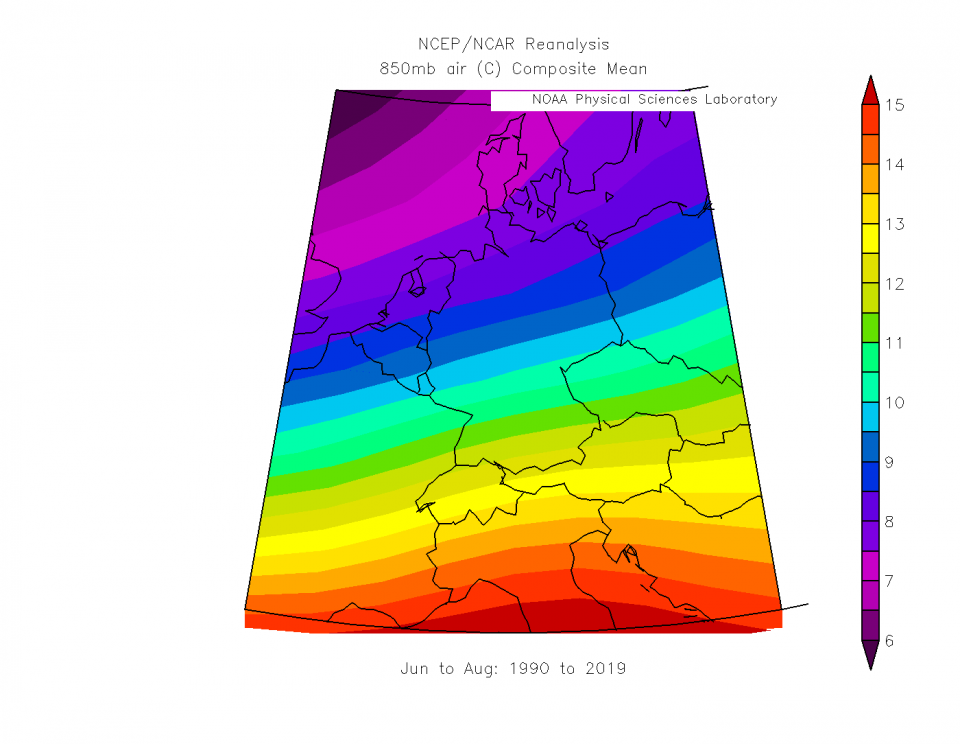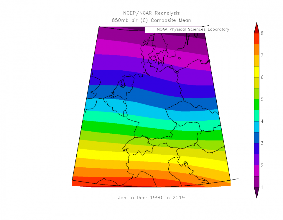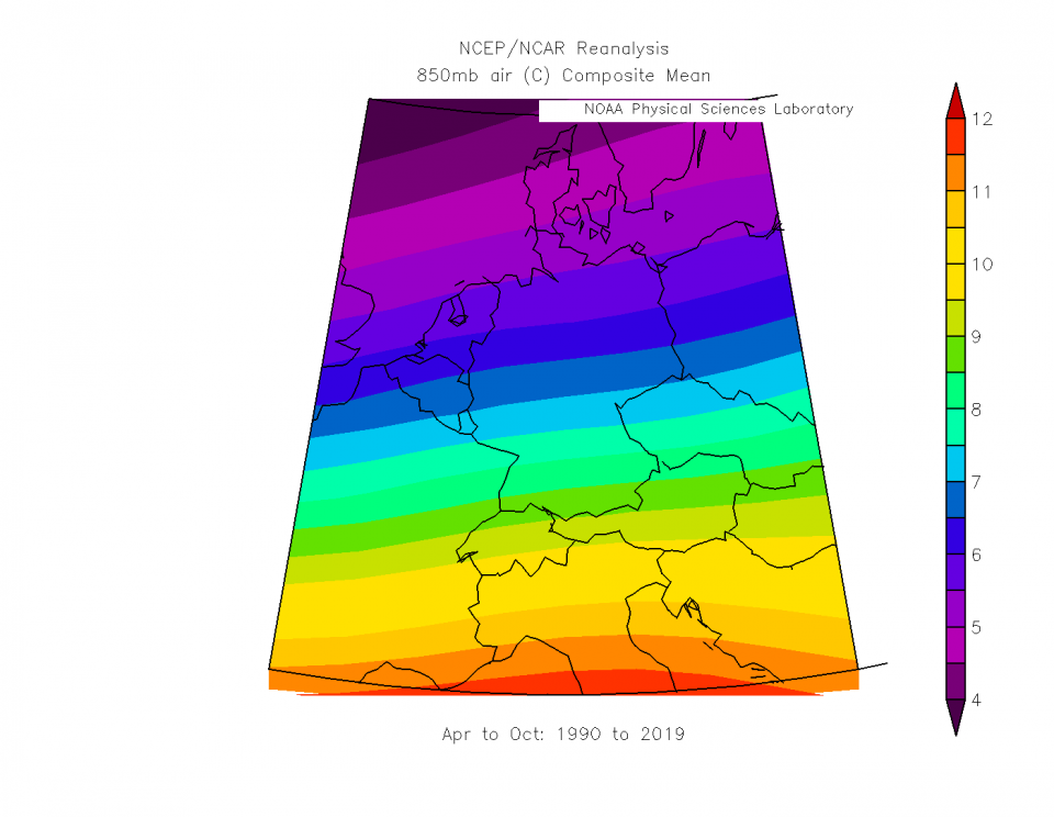 In den letzten 30 Jahren hatte es bei mir eine Durchschnittstemperatur in 850hpa von 9°C. Jede Linie weiter südlich bedeutet 1k wärmer. Außerdem erreicht man auch 1k Temperaturunterschied, wenn man 100-150m auf- oder absteigt, Cityeffekt kommt oben drauf. Da das ganze norddeutsche Tiefland mindestens 200m tiefer liegt als ich (360m) und nur 1k auf gleicher Höhe kälter ist, hat es ein wärmeres Klima als ich. Die Großstädte im Süden sind auch meist auf unter 360m gelegen und München und Stuttgart sind zu weit südlich, da ist es auf gleicher Höhe über 1k wärmer.