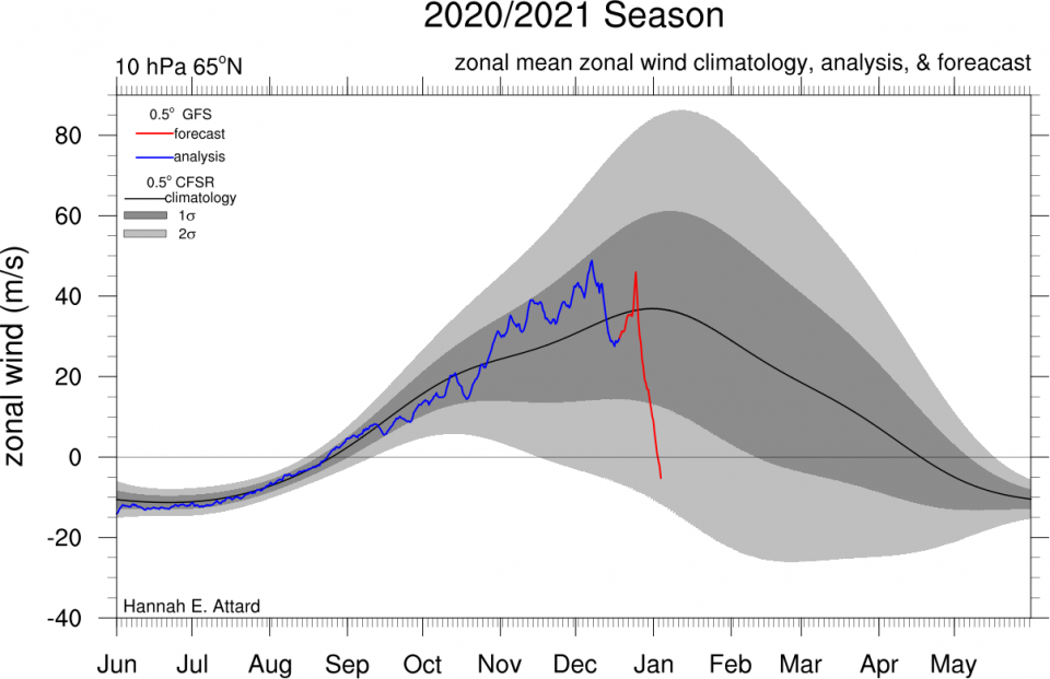 Eine Zonalwindumkehr in 30 hpa Anfang Januar 2021. Das wäre zeitlich in etwa mit dem 3. Wärmeschub des laufenden SSW anzusetzen. Könnte aber auch noch der 2. Wärmeschub sein, das lässt sich nicht genau sagen. Eigentlich wäre Anfang Januar etwas zu schnell für den 3. Wärmeschub, vielleicht reicht ja schon der 2. aus, aber bei dem starken Westwind derzeit - ich weiß ja nicht. Auch ist die Ozonkonzentration meiner Meinung nach an den entscheidenden Spielplätzen der Stratosphäre zu gering derzeit für eine so schnelle Entwicklung (Reihenfolge ist nämlich: erst die Erwärmung - dafür Ozon -, dann die Abschwächung des Westwinds). Ich kann mich aber natürlich auch irren. Vermutlich aber wird die Berechnung korrigiert und - wenn es denn eine Zonalwindumkehr geben sollte - dann käme sie erst etwa Mitte Januar (mit dem dann 3. Wärmeschub?!?). Nun, wir werden sehen, was geschehen wird.
