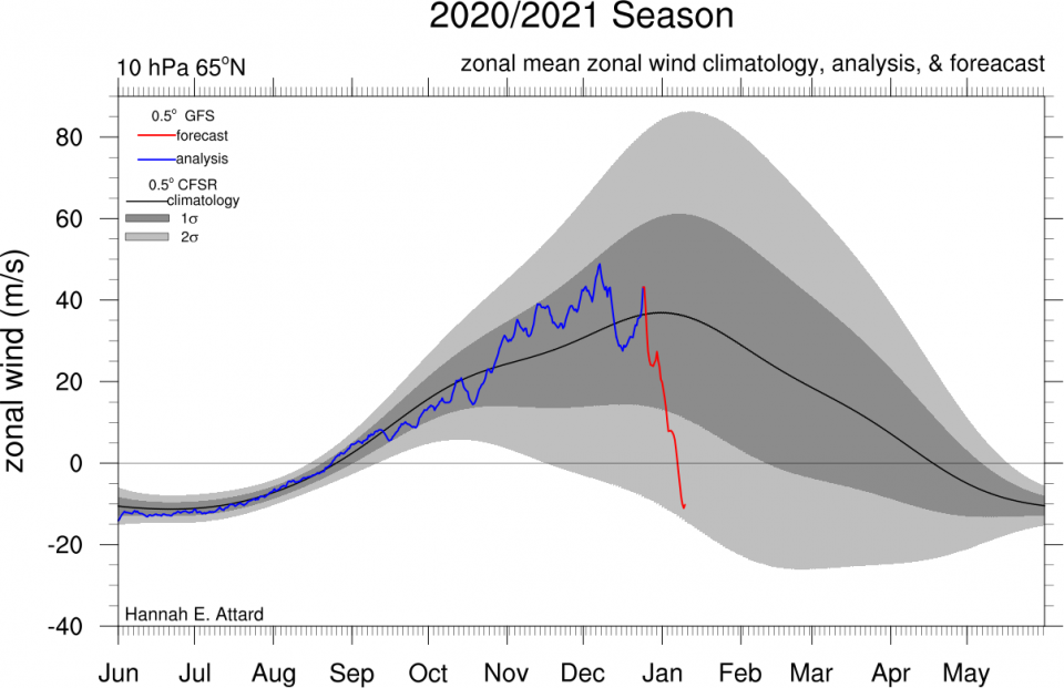 Negativer Zonalwind ist Ostwind. Das würde gepaart mit der raschen Erwärmung für die Erfüllung der Kriterien eines Major Warmings genügen können. Trotz aller Unsicherheiten der Berechnungen gehe ich selbst nun von einem Major Warming aus, vielleicht aber erst um den 10. Januar herum, also etwas später.