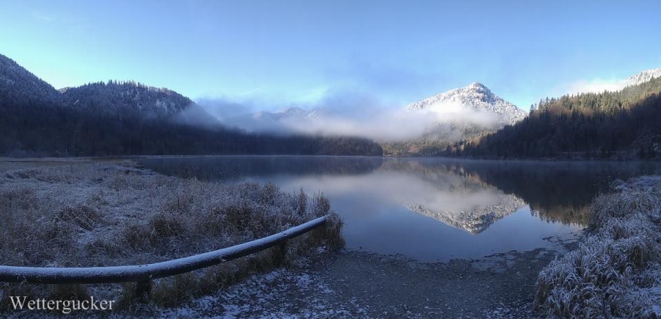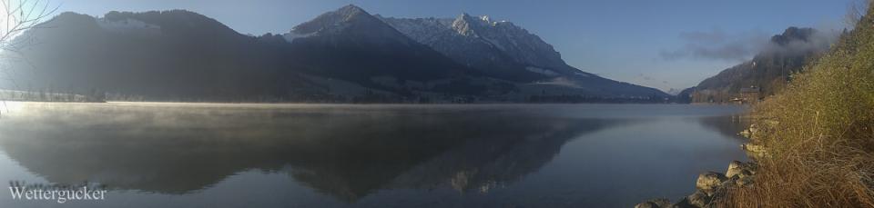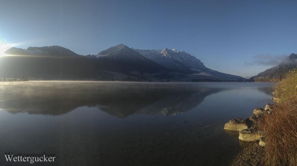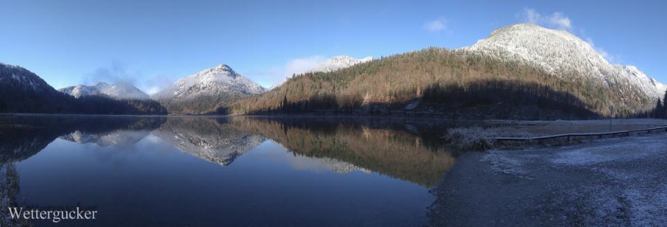 Gestartet vor Acht hier daheim bei -7,5Grad / Tmin -8Grad. Es war auf den Straßen spiegelglatt und nicht gestreut. Bis zum südlichen Talausgang war teilweise Schrittgeschwindigkeit angesagt! Der Weg führte mich vorbei am Walchsee zum Weitsee zwischen Reit im Winkl und Ruhpolding. Hier im Anschluss die Handybuidl. Die teilweise grandiosen Speigelreflexbuidl werden als extra Beitrag im Buidlforum nachgereicht.