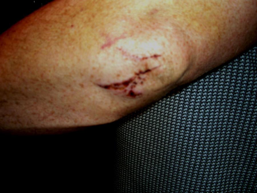 Lenkrad krumm durch die Hand, Tür innen zerdrückt mit Ellbogen und die Wirbelsäule hat auch was abgefangen..