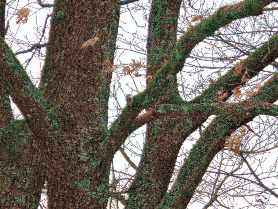 Er war sehr hektisch und schnell an der Eiche aufwärts unterwegs und war daher vom Objektiv (bei vollem Zoom und entsprechend kleinem Gesichtsfeld) nur schwer zu erhaschen: Ein Baumläufer war es und auf Grund des schlechten Fotos kann man nicht sicher bestimmen, ob es ein Garten oder Waldbaumläufer war..