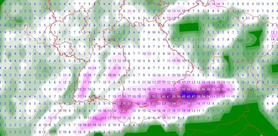 Vielmehr sorgen die südlichen Teiltiefs mit vorderseitiger Wärme, Wind und Regen dafür, dass die Kaltluft auch aus dem noch so Kälte-konservierenden alpinen Eck vertrieben wird, während es auf der Nordseite in höheren Lagen schneit: