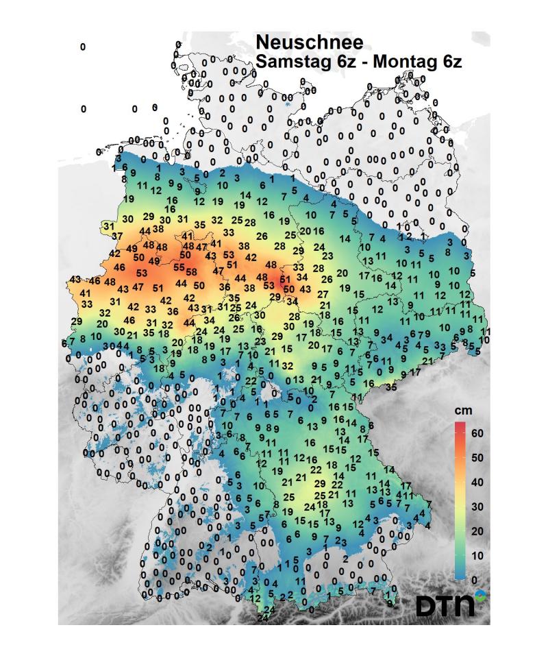 Bei Arome kann man die 850er einsehen und dort ist eine warme Nase in der Sonntagnacht von 3-5Uhr auf der höhe Venlo-Wesel, sonst südlicher mit um 0°C, dabei fallen etwa 5-10mm. Sollten also im Extremfall 10mm als Eisregen fallen, wären da noch verbreitet 20-25mm die als Schnee fallen und dann sollen da nur maximal 16cm liegen?