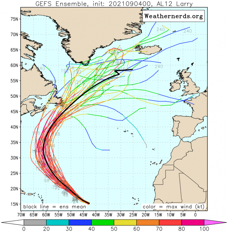 Der neue ECMWF-Lauf von heute früh liegt als Zugbahnberechnung noch nicht vor. Aber der Hauptlauf sieht den dann Ex-Hurricane Larry am 12. September direkt vor Grönland:
