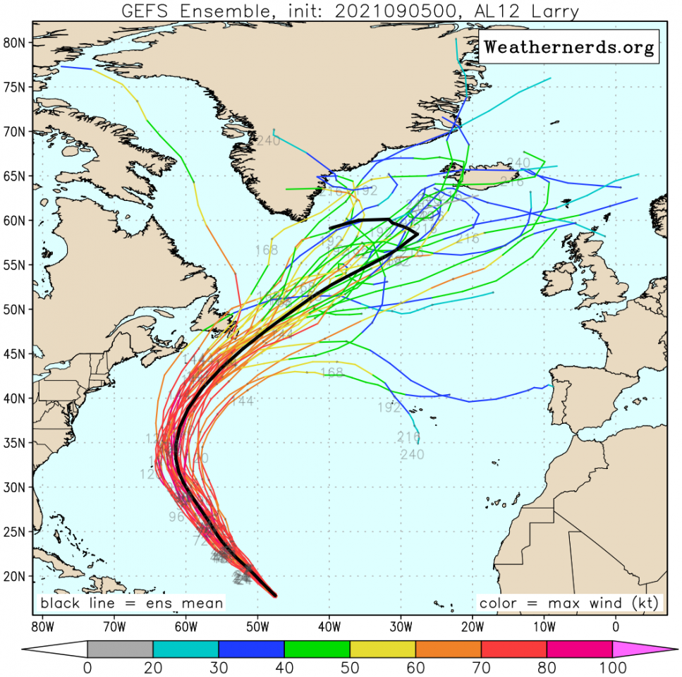 gestern wurde der Hurricane zum Major-Hurricane hochgestuft, er hat 115 mph Windgeschwindigkeiten erreicht, was etwa 185 km/h entspricht. Das Auge ist schon gut ausgebildet. Der Umfang des Systems wächst weiter. Die meisten Modellberechnungen sehen eine weitere Verstärkung auf KAT 4, einige wenige sogar KAT 5. Hier mal die verschiedenen Modelllösungen zu den Windstärken von Larry in den nächsten Tagen: