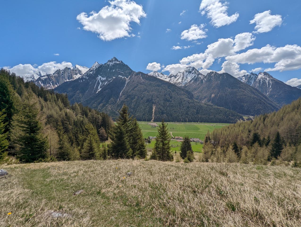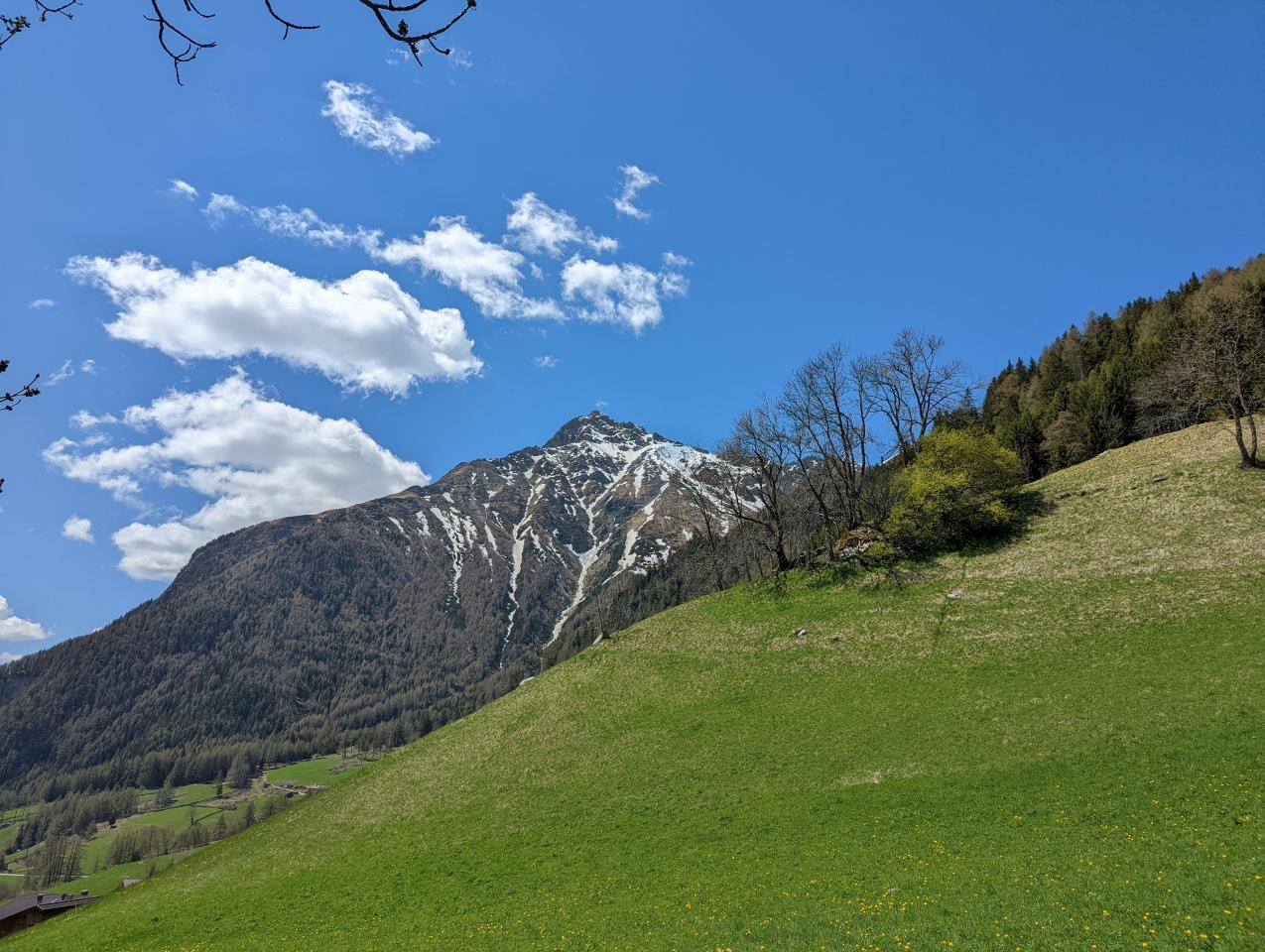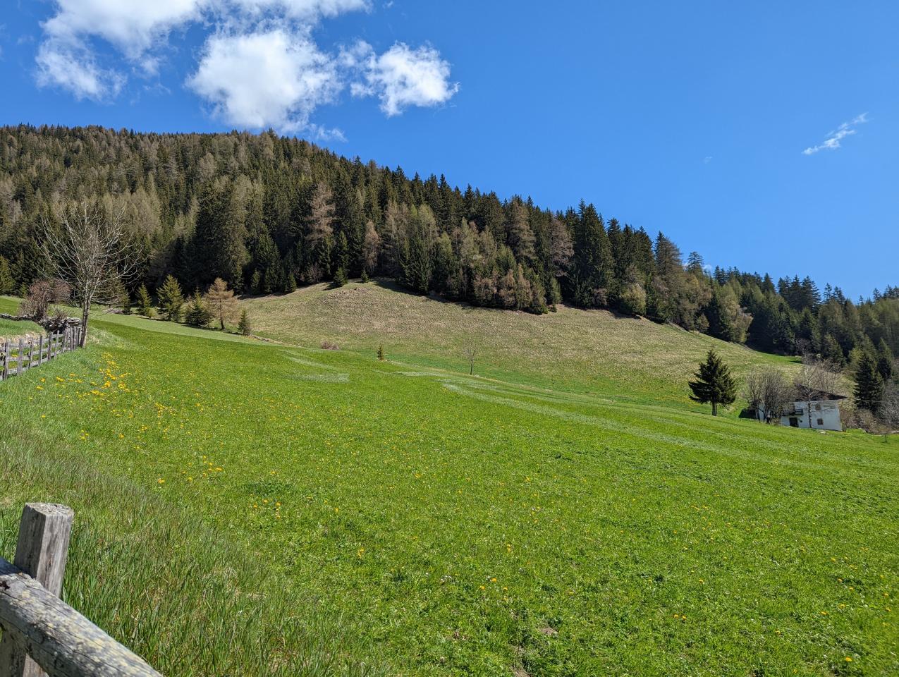 Etwas oberhalb von Kematen. Die Wiesen sind nun deutlich grüner geworden über den letzten 2 Wochen und der Löwenzahn blüht: