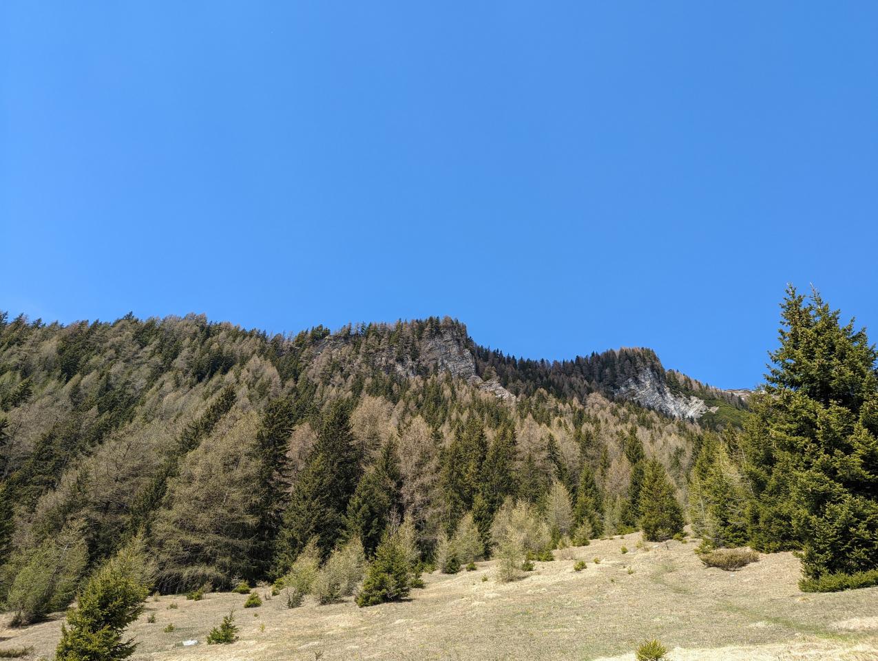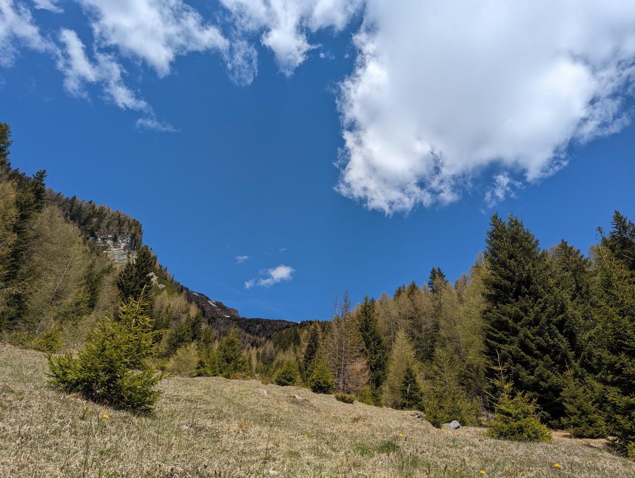Blick ins Tal auf etwa 1500m. Mittig im Hintergrund (die Bergspitze die hinter dem hang herausschaut) und der Berg ganz Links sind 3000er. Beide mit gut Schnee an den Nordseiten :