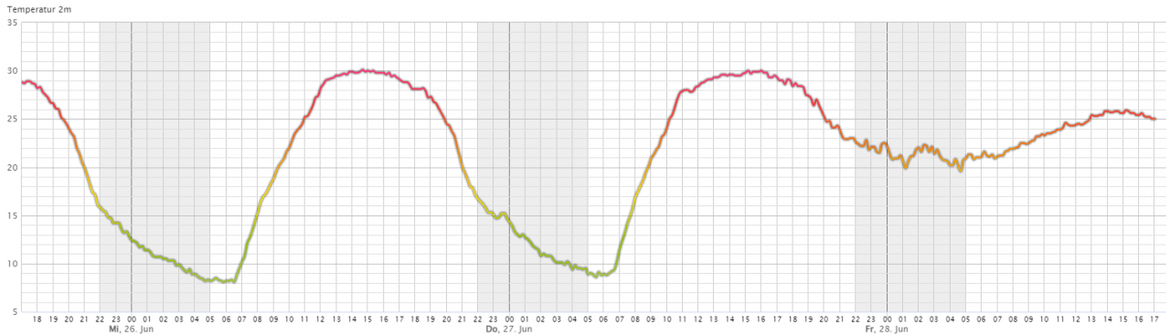 Selbst hier oben bei mir im Norden flüchte ich in einigen Nächten im Hochsommer in den Keller, weil es im Schlafzimmer zu warm ist. Nachts sollte es schon gerne um oder unter 15 Grad abkühlen, damit es sich gut schlafen lässt.