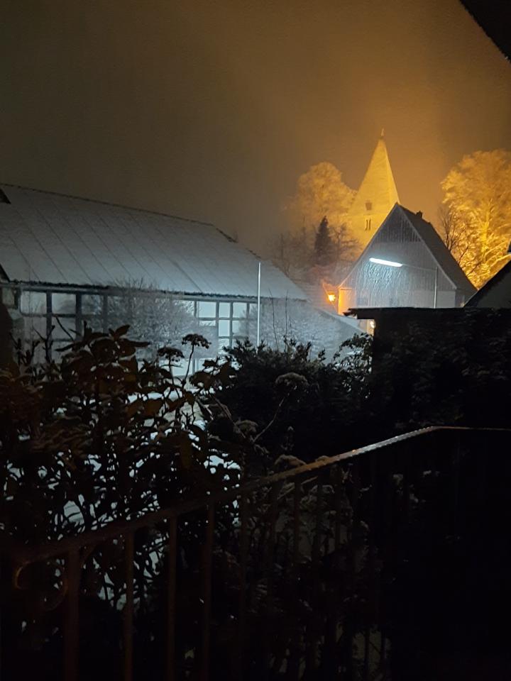 leichter Schneefall, ein kleines Bisschen Matsch bleibt auf günstigen Oberflächen liegen.