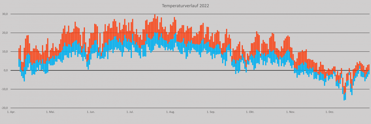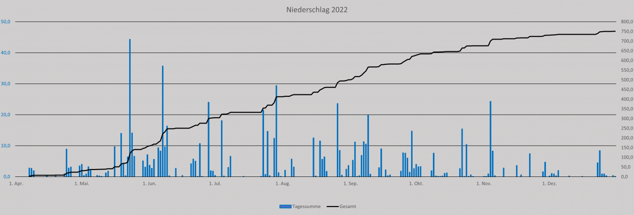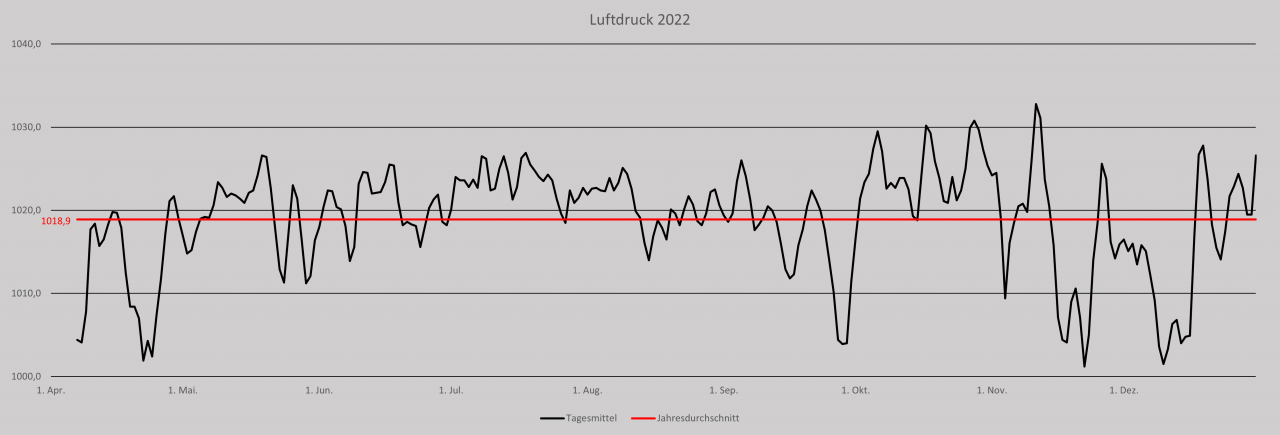2022 war stellenweise sehr warm und zu trocken. Der Sommer war als niederschlagsreichste Jahreszeit, eher trocken, vor allem in der zweiten Hälfte. Winter und Frühling waren, so ist es anderen Stationen zu entnehmen, ebenfalls eher trocken. Seit Messbeginn am 07.04.2022 wurden 750,6mm gemessen, alleine in dem Zeitraum sind etwas über 900mm normal. Das Luftdruckmittel von 1018,9hPa spricht auch für eine Hochdruckdominanz über das Jahr hinweg.