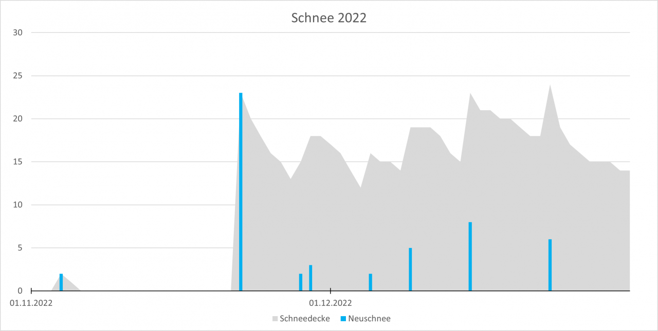Bei den Temperaturen herrschte fast durchgehend eine positive Anomalie. Der gesamte Sommer war deutlich zu warm. Insgesamt wurden im Sommerhalbjahr 26 Sommertage verzeichnet, das ist auf 1440m durchaus als extrem zu verzeichnen. Am 20. Juli wurde die 30°C nur um 0,2K verpasst. Auch die extremen Andauer von Hitzewellen (hier oben erkennbar an Tagen von über 23°C etwa) ist extrem gewesen. Im Unterland gab es teilweise über 2 Wochen hinweg Hitzetage. Zu kühle Wetterabschnitte gab es quasi nur zwei, einen in der zweiten Septemberhälfte mit dem ersten Schneefall auf Talhöhe und den Einbruch arktischer Luftmassen über den Alpenraum in der zweiten Dezemberdekade mit einem Tagestiefstwert von -16,0°C und im Talgrund an der Station St Jakob sogar nur -22,4°C.